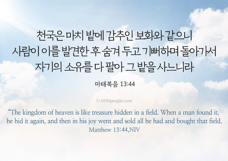 천국은 마치 밭에 감추인 보화와 같으니 사람이 이를 발견한 후 숨겨 두고 기뻐하며 돌아가서 자기의 소유를 다 팔아 그 밭을 사느니라 _마태복음 13:44