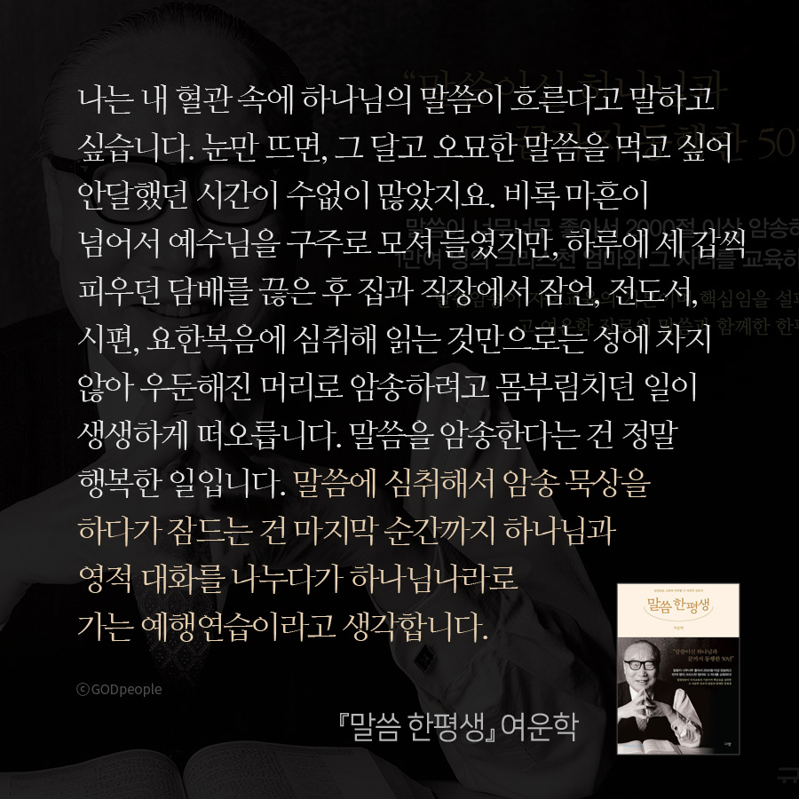 나는 내 혈관 속에 하나님의 말씀이 흐른다고 말하고 싶습니다. 눈만 뜨면, 그 달고 오묘한 말씀을 먹고 싶어 안달했던 시간이 수없이 많았지요. 비록 마흔이 넘어서 예수님을 구주로 모셔 들였지만, 하루에 세 갑씩 피우던 담배를 끊은 후 집과 직장에서 잠언, 전도서, 시편, 요한복음에 심취해 읽는 것만으로는 성에 차지 않아 우둔해진 머리로 암송하려고 몸부림치던 일이 생생하게 떠오릅니다. 말씀을 암송한다는 건 정말 행복한 일입니다. 말씀에 심취해서 암송 묵상을 하다가 잠드는 건 마지막 순간까지 하나님과 영적 대화를 나누다가 하나님나라로 가는 예행연습이라고 생각합니다.