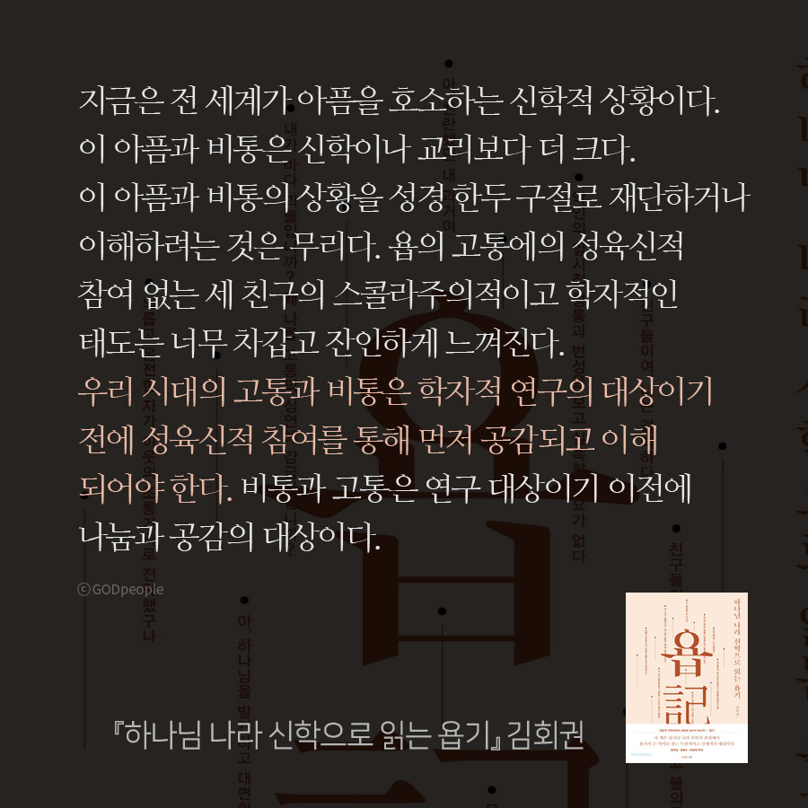지금은 전 세계가 아픔을 호소하는 신학적 상황이다. 이 아픔과 비통은 신학이나 교리보다 더 크다. 이 아픔과 비통의 상황을 성경 한두 구절로 재단하거나 이해하려는 것은 무리다. 욥의 고통에의 성육신적 참여 없는 세 친구의 스콜라주의적이고 학자적인 태도는 너무 차갑고 잔인하게 느껴진다. 우리 시대의 고통과 비통은 학자적 연구의 대상이기 전에 성육신적 참여를 통해 먼저 공감되고 이해되어야 한다. 비통과 고통은 연구 대상이기 이전에 나눔과 공감의 대상이다.