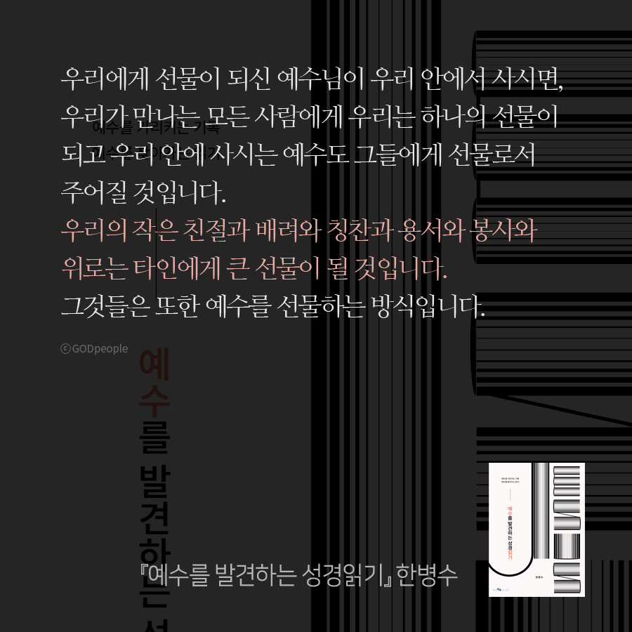 우리에게 선물이 되신 예수님이 우리 안에서 사시면, 우리가 만나는 모든 사람에게 우리는 하나의 선물이 되고 우리 안에 사시는 예수도 그들에게 선물로서 주어질 것입니다. 우리의 작은 친절과 배려와 칭찬과 용서와 봉사와 위로는 타인에게 큰 선물이 될 것입니다. 그것들은 또한 예수를 선물하는 방식입니다.