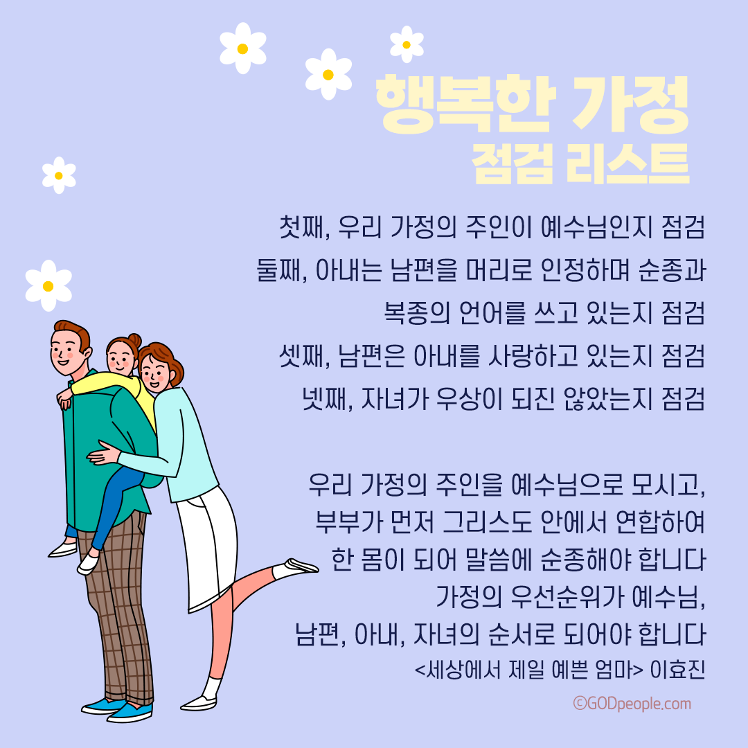 살아보니 세상의 기준을 따라가기 위해 쉼없이 달리고 따라해보았지만 그럴수록 결승점 깃발이 계속 이동하는 것 같은 기분이였습니다. 하지만 세상의 기준과는 다를지라도 태초부터 지금까지 변하지 않는 주님의 방법을 따를 때 진짜 하나님의 사랑을 누리는 가정으로 회복하게 될 것을 믿습니다!