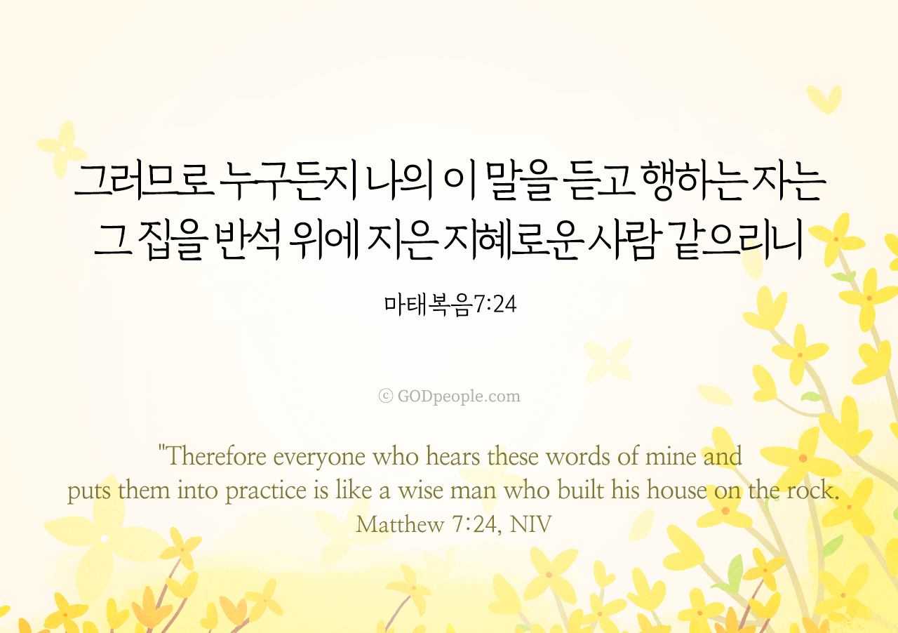 그러므로 누구든지 나의 이 말을 듣고 행하는 자는 그 집을 반석 위에 지은 지혜로운 사람 같으리니 _마태복음 7:24"Therefore everyone who hears these words of mine and puts them into practice is like a wise man who built his house on the rock. _Matthew 7:24, NIV ♥ 교도소 재소자에게 성경책을 보내드립니다. [플로잉전용상품] 재소자에게 성경책 보내기_우리말성경 단본(실버그린)우리말성경 단본 (무색인/무지퍼/페이퍼백/실버그린/DKV2406)두란노 편집부 [플로잉전용상품] 재소자에게 성경책 보내기_큰글로 읽는 우리말 비전성경 중단본(호박색)큰글로 읽는 우리말 비전성경 중단본(색인/무지퍼/PU/호박색/DKV2206)도서출판 두란노두란노 편집부 위 성경책을 구매 (플로잉 Flowing) 하시면 "프리즌 리바이벌 PRISON REVIVAL "을 통해서 국내 교정기관의 담장 안에서 지내시는 분들에게 전달됩니다.♥ 수용자 자녀에게 성경만화, 묵상365를 보내드립니다. [플로잉전용상품] 수용자 자녀에게 성경만화 보내기_만화 예수님의 생애 세트 (전3권)온 가족이 함께 보는 사복음서김동순 [플로잉전용상품] 수용자 자녀에게 성경만화 보내기_[개역개정판] 카툰성경 세트(완간/전3권)그린이 : 키이스 닐리, 데이비드 마일즈 [플로잉전용상품] 갓피플 통해 쌀 보내기_백미 (10kg)오픈스토리 [플로잉전용상품] 맛있는 반찬보내기_김치세트 (유기농백김치+겉절이)참식품주식회사 위 상품 구매 (플로잉 Flowing) 하시면 "세움"을 통해서 수용자(교도소 재소자) 자녀들에게 전달됩니다.+오늘의말씀으로 만들었어요♡ 오늘의말씀 아크릴 자석액자+말씀을 듣고 필사하세요♡ 개역개정 MP3 다운로드 | 태블릿으로 필사 | 종이노트로 필사 좋아요아멘개척교회 돕기 2025-03-17 · 3263 · 245 · 1오늘의말씀 말씀카드 마태복음7장24절 전도[주의] 계좌로 도움 요청글 발견시눌러 사용자차단을 눌러주세요!댓글 0입력댓글먼저최근순등록오늘의말씀더보기갓피플 오늘의말씀_역대상16장11절갓피플 오늘의말씀_역대상16장10절갓피플 오늘의말씀_디도서3장2절