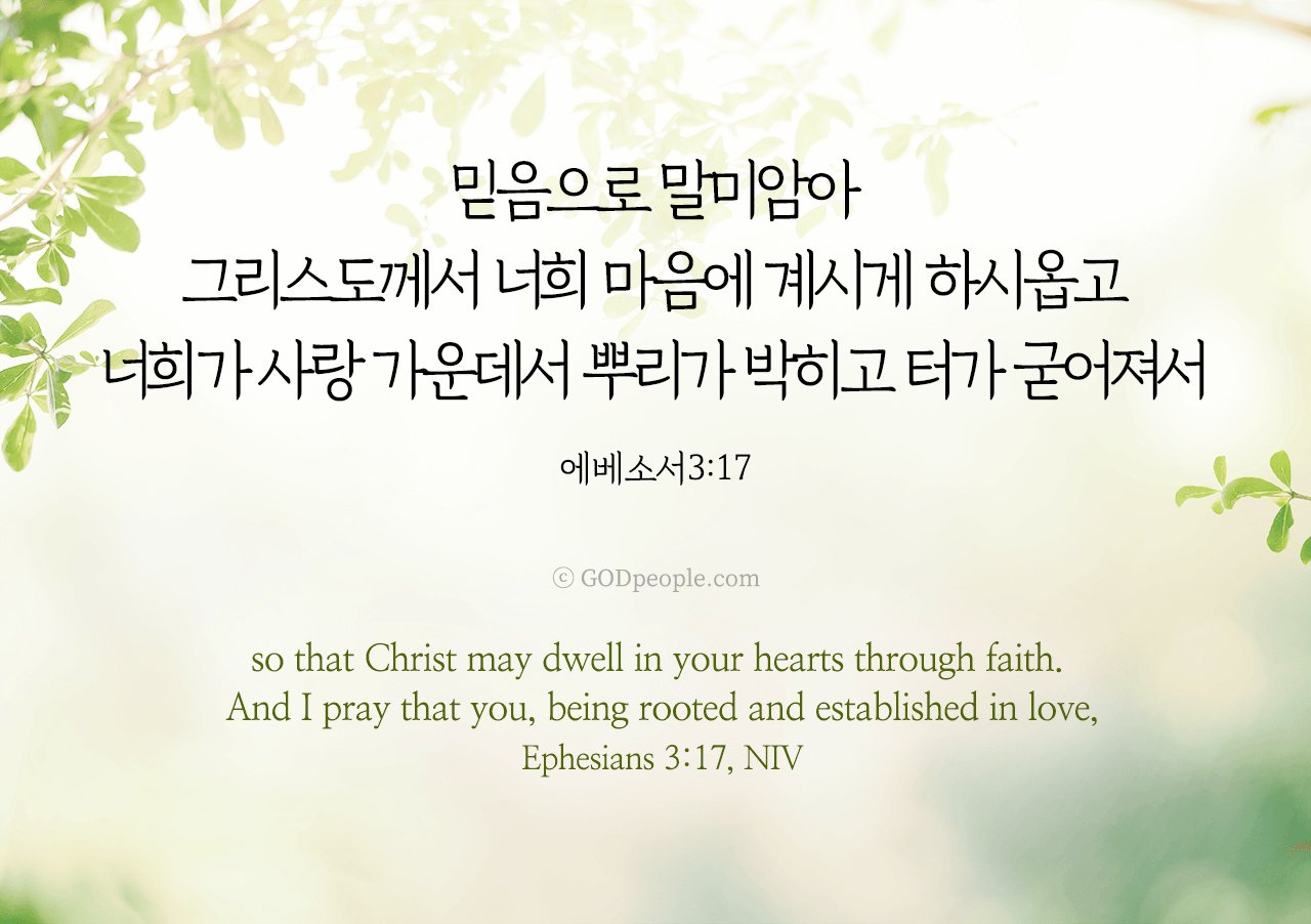 믿음으로 말미암아 그리스도께서 너희 마음에 계시게 하시옵고 너희가 사랑 가운데서 뿌리가 박히고 터가 굳어져서 _에베소서 3:17so that Christ may dwell in your hearts through faith. And I pray that you, being rooted and established in love, _Ephesians 3:17, NIV ♥ 교도소 재소자에게 성경책을 보내드립니다. [플로잉전용상품] 재소자에게 성경책 보내기_우리말성경 단본(실버그린)우리말성경 단본 (무색인/무지퍼/페이퍼백/실버그린/DKV2406)두란노 편집부 [플로잉전용상품] 재소자에게 성경책 보내기_큰글로 읽는 우리말 비전성경 중단본(호박색)큰글로 읽는 우리말 비전성경 중단본(색인/무지퍼/PU/호박색/DKV2206)도서출판 두란노두란노 편집부 위 성경책을 구매 (플로잉 Flowing) 하시면 "프리즌 리바이벌 PRISON REVIVAL "을 통해서 국내 교정기관의 담장 안에서 지내시는 분들에게 전달됩니다.♥ 수용자 자녀에게 성경만화, 묵상365를 보내드립니다. [플로잉전용상품] 수용자 자녀에게 성경만화 보내기_만화 예수님의 생애 세트 (전3권)온 가족이 함께 보는 사복음서김동순 [플로잉전용상품] 수용자 자녀에게 성경만화 보내기_[개역개정판] 카툰성경 세트(완간/전3권)그린이 : 키이스 닐리, 데이비드 마일즈 [플로잉전용상품] 갓피플 통해 쌀 보내기_백미 (10kg)오픈스토리 [플로잉전용상품] 맛있는 반찬보내기_김치세트 (유기농백김치+겉절이)참식품주식회사 위 상품 구매 (플로잉 Flowing) 하시면 "세움"을 통해서 수용자(교도소 재소자) 자녀들에게 전달됩니다.+오늘의말씀으로 만들었어요♡ 오늘의말씀 아크릴 자석액자+말씀을 듣고 필사하세요♡ 개역개정 MP3 다운로드 | 태블릿으로 필사 | 종이노트로 필사 좋아요아멘개척교회 돕기 2025-04-08 · 3804 · 221 · 2오늘의말씀말씀카드에베소서3장17절전도[주의] 계좌로 도움 요청글 발견시눌러 사용자차단을 눌러주세요!댓글 0입력댓글먼저최근순등록오늘의말씀더보기갓피플 오늘의말씀_창세기3장5절갓피플 오늘의말씀_시편5편7절갓피플 오늘의말씀_요한복음21장22절