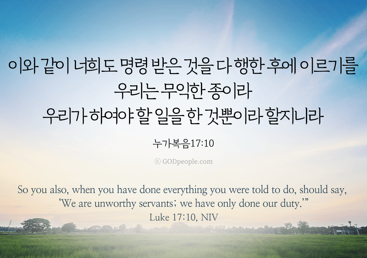이와 같이 너희도 명령 받은 것을 다 행한 후에 이르기를 우리는 무익한 종이라 우리가 하여야 할 일을 한 것뿐이라 할지니라 _누가복음 17:10So you also, when you have done everything you were told to do, should say, 'We are unworthy servants; we have only done our duty.'" _Luke 17:10, NIV ♥ 교도소 재소자에게 성경책을 보내드립니다. [플로잉전용상품] 재소자에게 성경책 보내기_우리말성경 단본(실버그린)우리말성경 단본 (무색인/무지퍼/페이퍼백/실버그린/DKV2406)두란노 편집부 [플로잉전용상품] 재소자에게 성경책 보내기_큰글로 읽는 우리말 비전성경 중단본(호박색)큰글로 읽는 우리말 비전성경 중단본(색인/무지퍼/PU/호박색/DKV2206)도서출판 두란노두란노 편집부 위 성경책을 구매 (플로잉 Flowing) 하시면 "프리즌 리바이벌 PRISON REVIVAL "을 통해서 국내 교정기관의 담장 안에서 지내시는 분들에게 전달됩니다.♥ 수용자 자녀에게 성경만화, 묵상365를 보내드립니다. [플로잉전용상품] 수용자 자녀에게 성경만화 보내기_만화 예수님의 생애 세트 (전3권)온 가족이 함께 보는 사복음서김동순 [플로잉전용상품] 수용자 자녀에게 성경만화 보내기_[개역개정판] 카툰성경 세트(완간/전3권)그린이 : 키이스 닐리, 데이비드 마일즈 [플로잉전용상품] 갓피플 통해 쌀 보내기_백미 (10kg)오픈스토리 [플로잉전용상품] 맛있는 반찬보내기_김치세트 (유기농백김치+겉절이)참식품주식회사 위 상품 구매 (플로잉 Flowing) 하시면 "세움"을 통해서 수용자(교도소 재소자) 자녀들에게 전달됩니다.+오늘의말씀으로 만들었어요♡ 오늘의말씀 아크릴 자석액자+말씀을 듣고 필사하세요♡ 개역개정 MP3 다운로드 | 태블릿으로 필사 | 종이노트로 필사 좋아요아멘개척교회 돕기 2025-04-15 · 2582 · 210 · 오늘의말씀 말씀카드 누가복음17장10절 전도오늘의말씀더보기갓피플 오늘의말씀_시편126편5절_2019.9.28갓피플 오늘의말씀_잠언4장24절_2019.9.29갓피플 오늘의말씀_신명기28장8절_2019.9.25