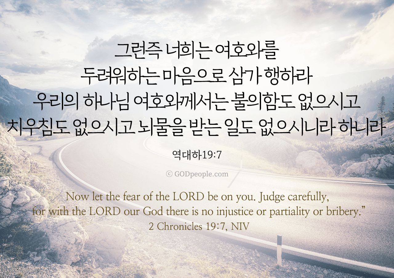 그런즉 너희는 여호와를 두려워하는 마음으로 삼가 행하라 우리의 하나님 여호와께서는 불의함도 없으시고 치우침도 없으시고 뇌물을 받는 일도 없으시니라 하니라 _역대하 19:7