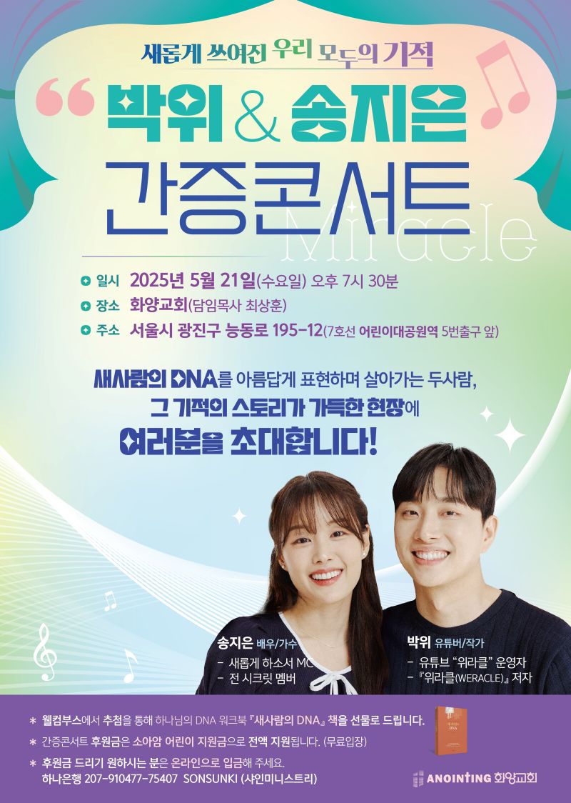 - 박위 형제의 간증과 송지은 자매의 찬양을 통해 은혜 가득한 시간이 될 것입니다.