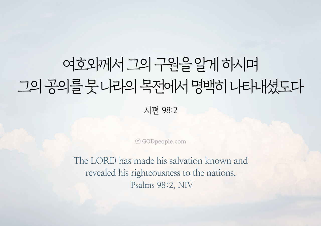여호와께서 그의 구원을 알게 하시며 그의 공의를 뭇 나라의 목전에서 명백히 나타내셨도다 _시편 98:2The LORD has made his salvation known and revealed his righteousness to the nations. _Psalms 98:2, NIV ♥ 교도소 재소자에게 성경책을 보내드립니다. [플로잉전용상품] 재소자에게 성경책 보내기_우리말성경 단본(실버그린)우리말성경 단본 (무색인/무지퍼/페이퍼백/실버그린/DKV2406)두란노 편집부 [플로잉전용상품] 재소자에게 성경책 보내기_큰글로 읽는 우리말 비전성경 중단본(호박색)큰글로 읽는 우리말 비전성경 중단본(색인/무지퍼/PU/호박색/DKV2206)도서출판 두란노두란노 편집부 위 성경책을 구매 (플로잉 Flowing) 하시면 "프리즌 리바이벌 PRISON REVIVAL "을 통해서 국내 교정기관의 담장 안에서 지내시는 분들에게 전달됩니다.♥ 수용자 자녀에게 성경만화, 묵상365를 보내드립니다. [플로잉전용상품] 수용자 자녀에게 성경만화 보내기_만화 예수님의 생애 세트 (전3권)온 가족이 함께 보는 사복음서김동순 [플로잉전용상품] 수용자 자녀에게 성경만화 보내기_[개역개정판] 카툰성경 세트(완간/전3권)그린이 : 키이스 닐리, 데이비드 마일즈 [플로잉전용상품] 갓피플 통해 쌀 보내기_백미 (10kg)오픈스토리 [플로잉전용상품] 맛있는 반찬보내기_김치세트 (유기농백김치+겉절이)참식품주식회사 위 상품 구매 (플로잉 Flowing) 하시면 "세움"을 통해서 수용자(교도소 재소자) 자녀들에게 전달됩니다.+오늘의말씀으로 만들었어요♡ 오늘의말씀 아크릴 자석액자+말씀을 듣고 필사하세요♡ 개역개정 MP3 다운로드 | 태블릿으로 필사 | 종이노트로 필사 좋아요아멘개척교회 돕기 2025-05-16 · 2983 · 262 · 오늘의말씀 말씀카드 시편98편2절 전도[주의] 계좌로 도움 요청글 발견시눌러 사용자차단을 눌러주세요!댓글 0입력댓글먼저최근순등록오늘의말씀더보기갓피플 오늘의말씀_시편5편12절갓피플 오늘의말씀_잠언 3장18절갓피플 오늘의말씀_역대상16장34절