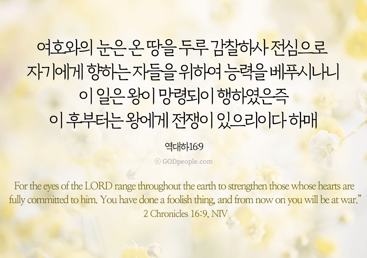 여호와의 눈은 온 땅을 두루 감찰하사 전심으로 자기에게 향하는 자들을 위하여 능력을 베푸시나니 이 일은 왕이 망령되이 행하였은즉 이 후부터는 왕에게 전쟁이 있으리이다 하매 _역대하 16:9