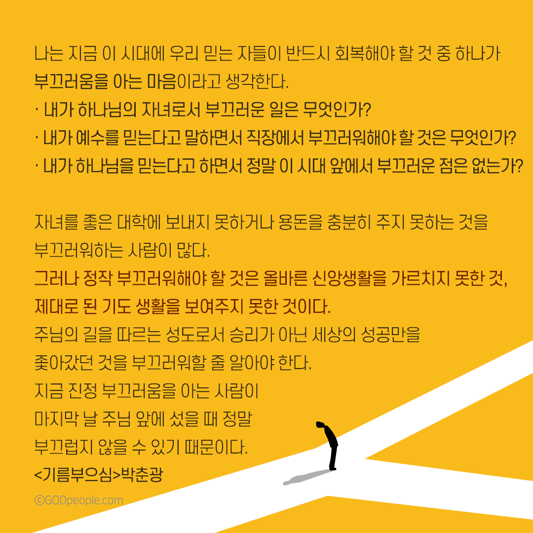 지금 진정 부끄러움을 아는 사람이 마지막 날 주님 앞에 섰을 때 정말 부끄럽지 않을 수 있기 때문이다.