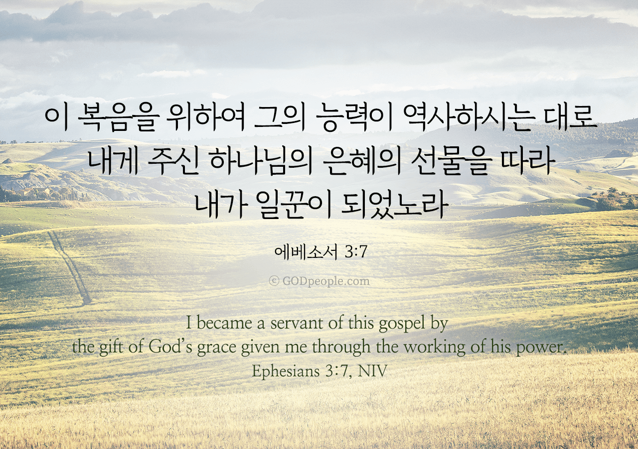 이 복음을 위하여 그의 능력이 역사하시는 대로 내게 주신 하나님의 은혜의 선물을 따라 내가 일꾼이 되었노라 _에베소서 3:7I became a servant of this gospel by the gift of God's grace given me through the working of his power. _Ephesians 3:7, NIV ♥ 교도소 재소자에게 성경책을 보내드립니다. [플로잉전용상품] 재소자에게 성경책 보내기_우리말성경 단본(실버그린)우리말성경 단본 (무색인/무지퍼/페이퍼백/실버그린/DKV2406)두란노 편집부 [플로잉전용상품] 재소자에게 성경책 보내기_큰글로 읽는 우리말 비전성경 중단본(호박색)큰글로 읽는 우리말 비전성경 중단본(색인/무지퍼/PU/호박색/DKV2206)도서출판 두란노두란노 편집부 위 성경책을 구매 (플로잉 Flowing) 하시면 "프리즌 리바이벌 PRISON REVIVAL "을 통해서 국내 교정기관의 담장 안에서 지내시는 분들에게 전달됩니다.♥ 수용자 자녀에게 성경만화, 묵상365를 보내드립니다. [플로잉전용상품] 수용자 자녀에게 성경만화 보내기_만화 예수님의 생애 세트 (전3권)온 가족이 함께 보는 사복음서김동순 [플로잉전용상품] 수용자 자녀에게 성경만화 보내기_[개역개정판] 카툰성경 세트(완간/전3권)그린이 : 키이스 닐리, 데이비드 마일즈 [플로잉전용상품] 갓피플 통해 쌀 보내기_백미 (10kg)오픈스토리 [플로잉전용상품] 맛있는 반찬보내기_김치세트 (유기농백김치+겉절이)참식품주식회사 위 상품 구매 (플로잉 Flowing) 하시면 "세움"을 통해서 수용자(교도소 재소자) 자녀들에게 전달됩니다.+오늘의말씀으로 만들었어요♡ 오늘의말씀 아크릴 자석액자+말씀을 듣고 필사하세요♡ 개역개정 MP3 다운로드 | 태블릿으로 필사 | 종이노트로 필사 좋아요아멘개척교회 돕기 2025-06-01 · 2188 · 114 · 오늘의말씀 말씀카드 에베소서3장7절 전도[주의] 계좌로 도움 요청글 발견시눌러 사용자차단을 눌러주세요!댓글 0입력댓글먼저최근순등록오늘의말씀더보기갓피플 오늘의말씀_시편63편1절갓피플 오늘의말씀_역대하7장15절갓피플 오늘의말씀_로마서12장9절