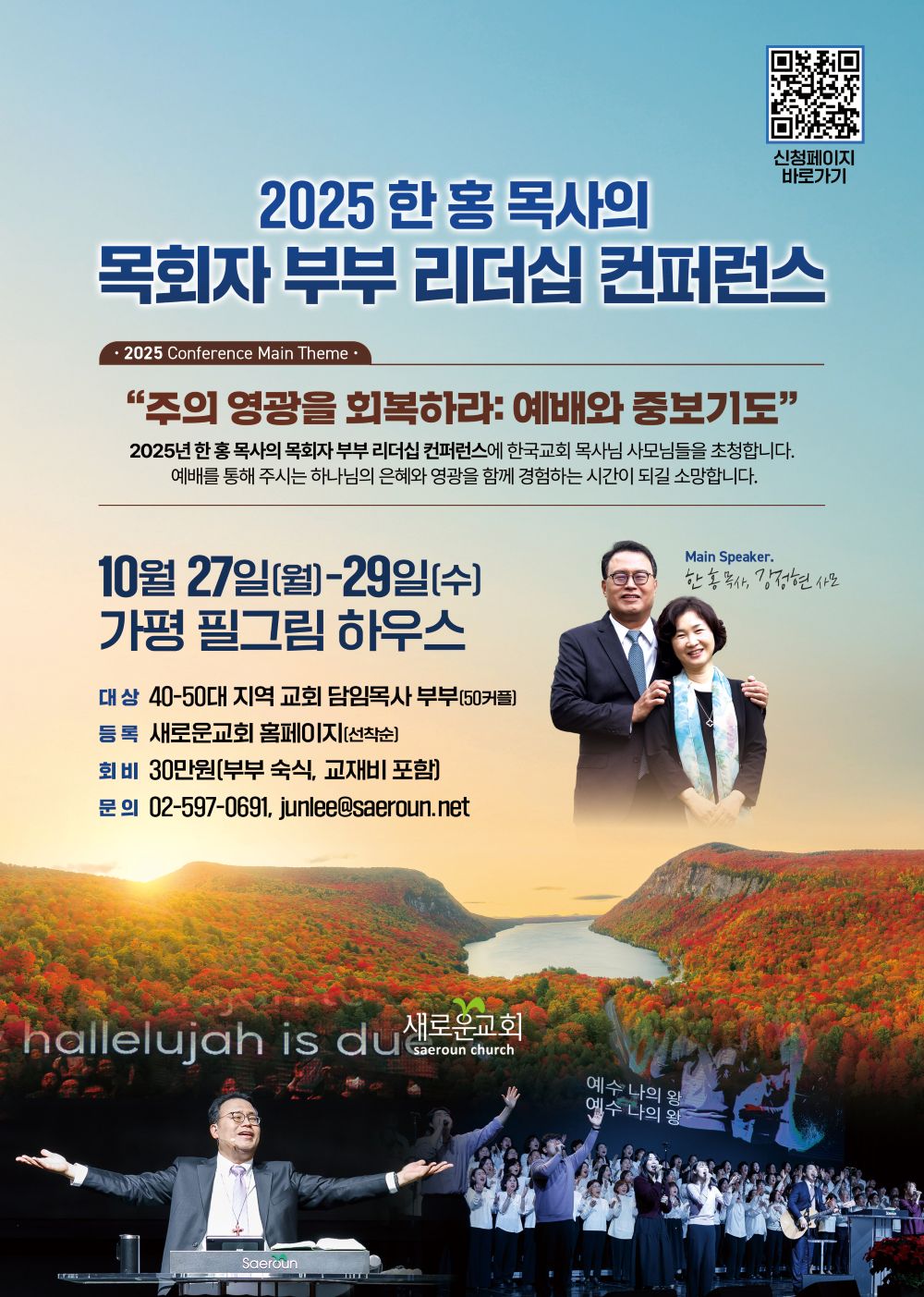 2025 한 홍 목사의 목회자 부부 리더십 컨퍼런스가 오는 10월 27일(월)부터 29일(수)까지 ‘주의 영광을 회복하라: 예배와 중보기도’라는 주제로 가평 필그림 하우스에서 개최된다.