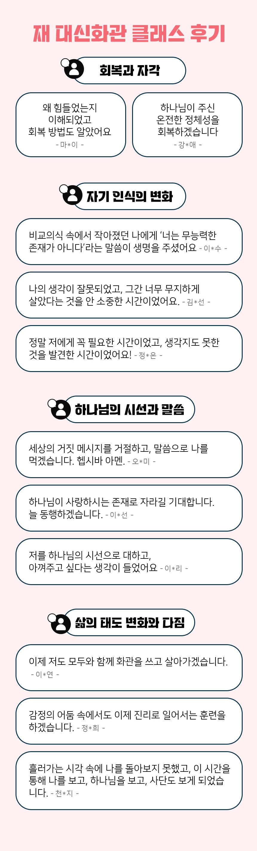 이러한 경험을 바탕으로 '재 대신 화관' 강의를 열게 되었습니다. 그녀의 강의는 단순한 이론이 아닌, 신앙의 여정을 직접 걸어온