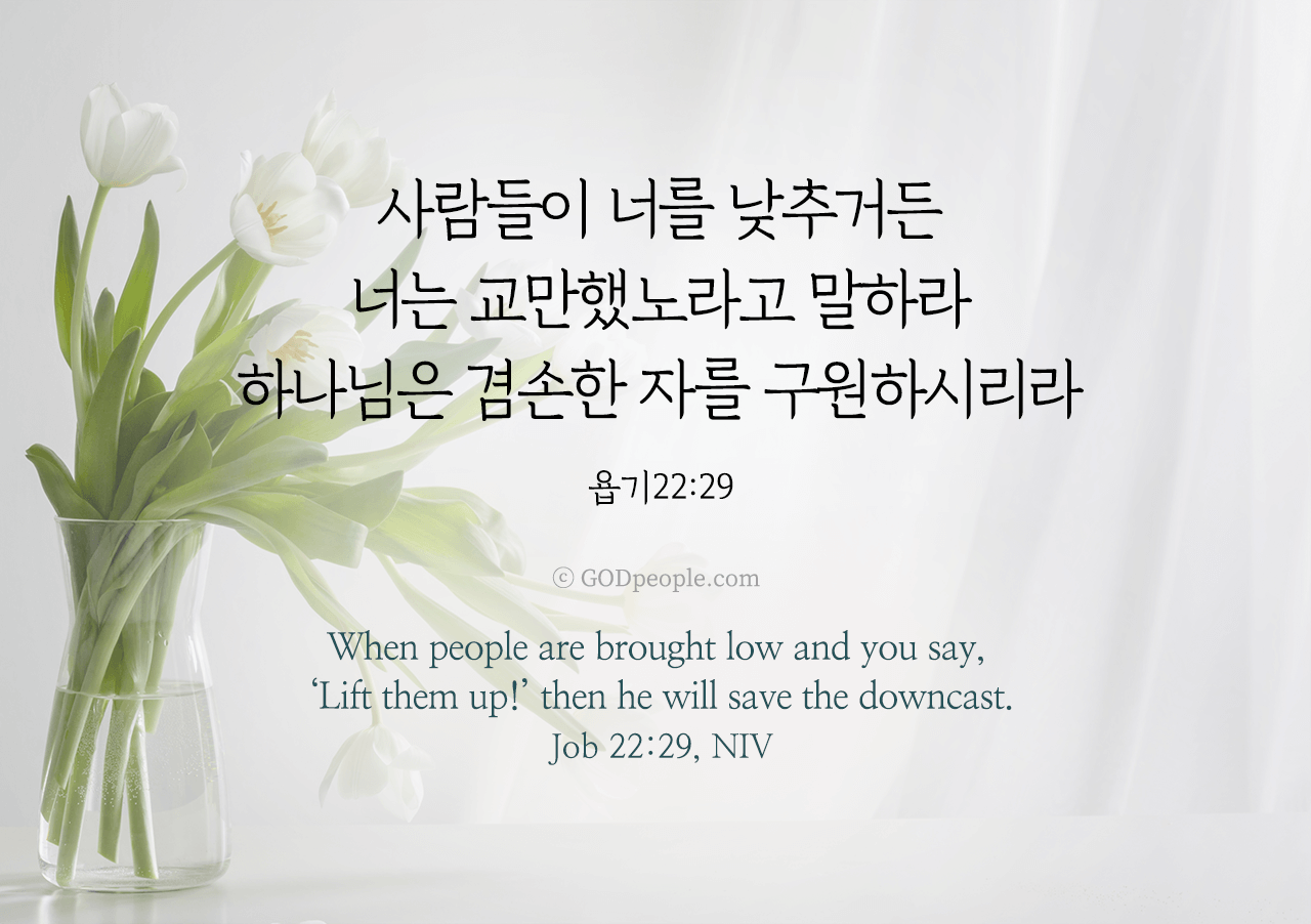 사람들이 너를 낮추거든 너는 교만했노라고 말하라 하나님은 겸손한 자를 구원하시리라 _욥기 22:29When people are brought low and you say, 'Lift them up!' then he will save the downcast. _Job 22:29, NIV ♥ 교도소 재소자에게 성경책을 보내드립니다. [플로잉전용상품] 재소자에게 성경책 보내기_우리말성경 단본(실버그린)우리말성경 단본 (무색인/무지퍼/페이퍼백/실버그린/DKV2406)두란노 편집부 [플로잉전용상품] 재소자에게 성경책 보내기_큰글로 읽는 우리말 비전성경 중단본(호박색)큰글로 읽는 우리말 비전성경 중단본(색인/무지퍼/PU/호박색/DKV2206)도서출판 두란노두란노 편집부 위 성경책을 구매 (플로잉 Flowing) 하시면 "프리즌 리바이벌 PRISON REVIVAL "을 통해서 국내 교정기관의 담장 안에서 지내시는 분들에게 전달됩니다.♥ 수용자 자녀에게 성경만화, 묵상365를 보내드립니다. [플로잉전용상품] 수용자 자녀에게 성경만화 보내기_만화 예수님의 생애 세트 (전3권)온 가족이 함께 보는 사복음서김동순 [플로잉전용상품] 수용자 자녀에게 성경만화 보내기_[개역개정판] 카툰성경 세트(완간/전3권)그린이 : 키이스 닐리, 데이비드 마일즈 [플로잉전용상품] 갓피플 통해 쌀 보내기_백미 (10kg)오픈스토리 [플로잉전용상품] 맛있는 반찬보내기_김치세트 (유기농백김치+겉절이)참식품주식회사 위 상품 구매 (플로잉 Flowing) 하시면 "세움"을 통해서 수용자(교도소 재소자) 자녀들에게 전달됩니다.+오늘의말씀으로 만들었어요♡ 오늘의말씀 아크릴 자석액자+말씀을 듣고 필사하세요♡ 개역개정 MP3 다운로드 | 태블릿으로 필사 | 종이노트로 필사 좋아요아멘개척교회 돕기 2025-07-27 · 4417 · 133 · 오늘의말씀 말씀카드 욥기22장29절 전도식물더보기주의 말씀대로 주의 말씀대로 주의 말씀대로