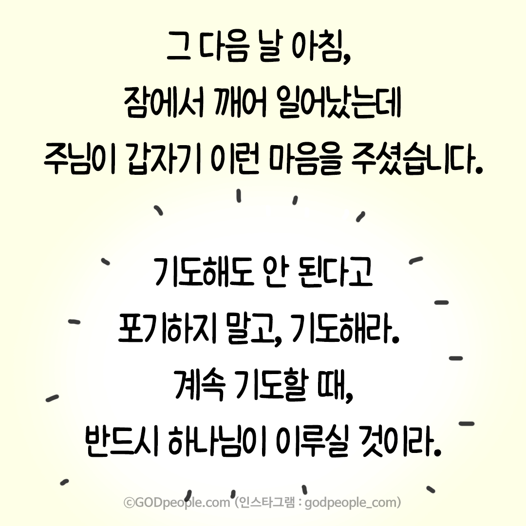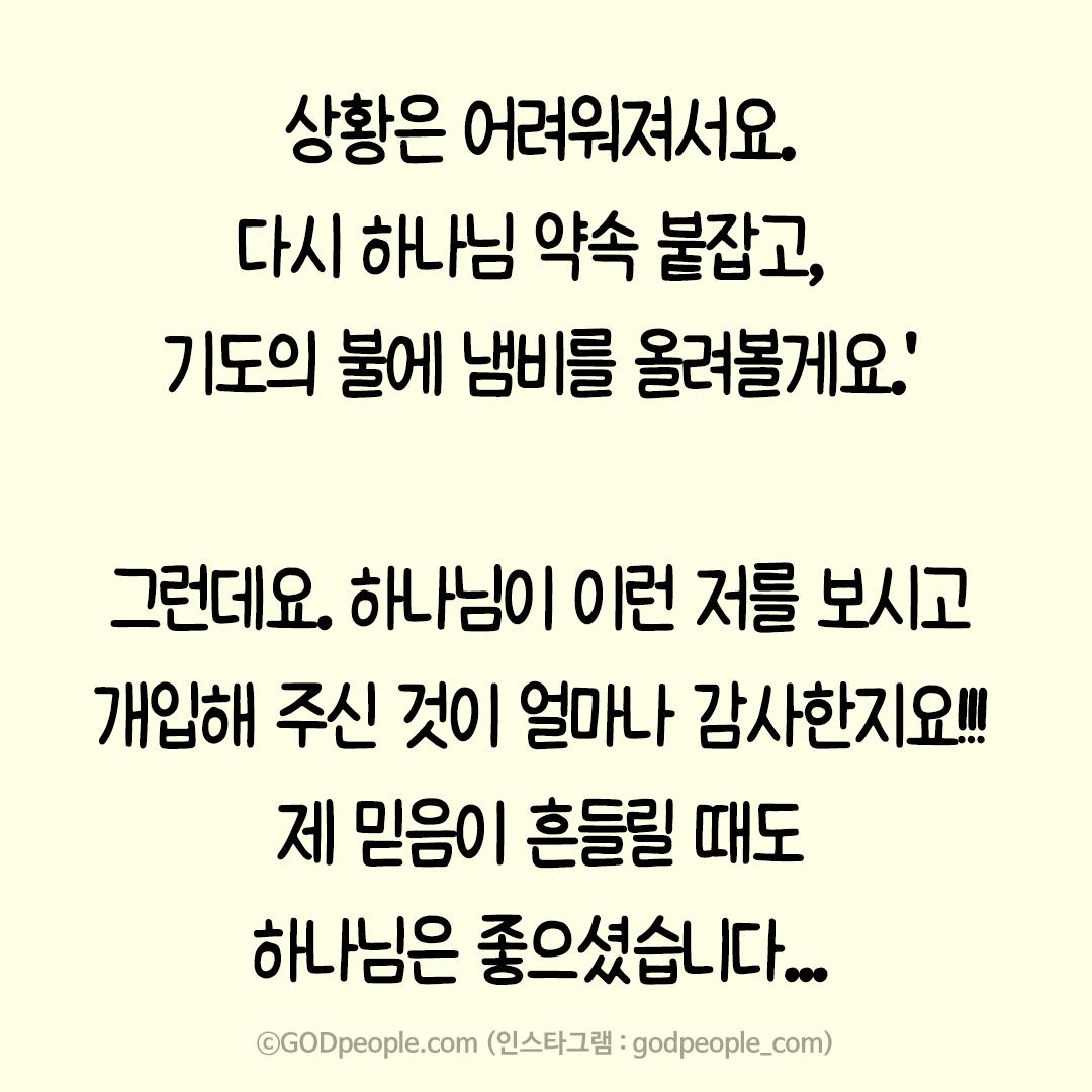 ▽ 2탄 보기https://cnts.godpeople.com/p/81548 * 갓피플 인스타 : 인스타에서도 갓피플을 만날 수 있어요! (팔로잉~)▶ http://www.instagram.com/godpeople_com 좋아요아멘개척교회 돕기 2025-08-04 · 2529 · 83 · 4기도실망응답갓피플인스타[주의] 계좌로 도움 요청글 발견시눌러 사용자차단을 눌러주세요!댓글 0입력댓글먼저최근순등록갓피플 인스타더보기하나님께 맡긴다는 것은, 아무것도 안한다는 것이 아닙니다. (ft.간증)많은 사람들이 오해하는 1가지 . 있는 모습 그대로 사랑하시니까, 죄를 지은 내 모습도 괜찮을까?죽을 것 같은 위기를 만났을 때 (ft. 실화)
