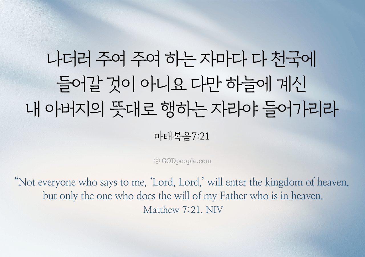 나더러 주여 주여 하는 자마다 다 천국에 들어갈 것이 아니요 다만 하늘에 계신 내 아버지의 뜻대로 행하는 자라야 들어가리라 _마태복음 7:21"Not everyone who says to me, 'Lord, Lord,' will enter the kingdom of heaven, but only the one who does the will of my Father who is in heaven. _Matthew 7:21, NIV ♥ 교도소 재소자에게 성경책을 보내드립니다. [플로잉전용상품] 재소자에게 성경책 보내기_우리말성경 단본(실버그린)우리말성경 단본 (무색인/무지퍼/페이퍼백/실버그린/DKV2406)두란노 편집부 [플로잉전용상품] 재소자에게 성경책 보내기_큰글로 읽는 우리말 비전성경 중단본(호박색)큰글로 읽는 우리말 비전성경 중단본(색인/무지퍼/PU/호박색/DKV2206)도서출판 두란노두란노 편집부 위 성경책을 구매 (플로잉 Flowing) 하시면 "프리즌 리바이벌 PRISON REVIVAL "을 통해서 국내 교정기관의 담장 안에서 지내시는 분들에게 전달됩니다.♥ 수용자 자녀에게 성경만화, 묵상365를 보내드립니다. [플로잉전용상품] 수용자 자녀에게 성경만화 보내기_만화 예수님의 생애 세트 (전3권)온 가족이 함께 보는 사복음서김동순 [플로잉전용상품] 수용자 자녀에게 성경만화 보내기_[개역개정판] 카툰성경 세트(완간/전3권)그린이 : 키이스 닐리, 데이비드 마일즈 [플로잉전용상품] 갓피플 통해 쌀 보내기_백미 (10kg)오픈스토리 [플로잉전용상품] 맛있는 반찬보내기_김치세트 (유기농백김치+겉절이)참식품주식회사 위 상품 구매 (플로잉 Flowing) 하시면 "세움"을 통해서 수용자(교도소 재소자) 자녀들에게 전달됩니다.+오늘의말씀으로 만들었어요♡ 오늘의말씀 아크릴 자석액자+말씀을 듣고 필사하세요♡ 개역개정 MP3 다운로드 | 태블릿으로 필사 | 종이노트로 필사 좋아요아멘개척교회 돕기 2025-08-10 · 3849 · 121 · 오늘의말씀 말씀카드 마태복음7장21절 전도식물더보기주의 말씀대로 주의 말씀대로 주의 말씀대로