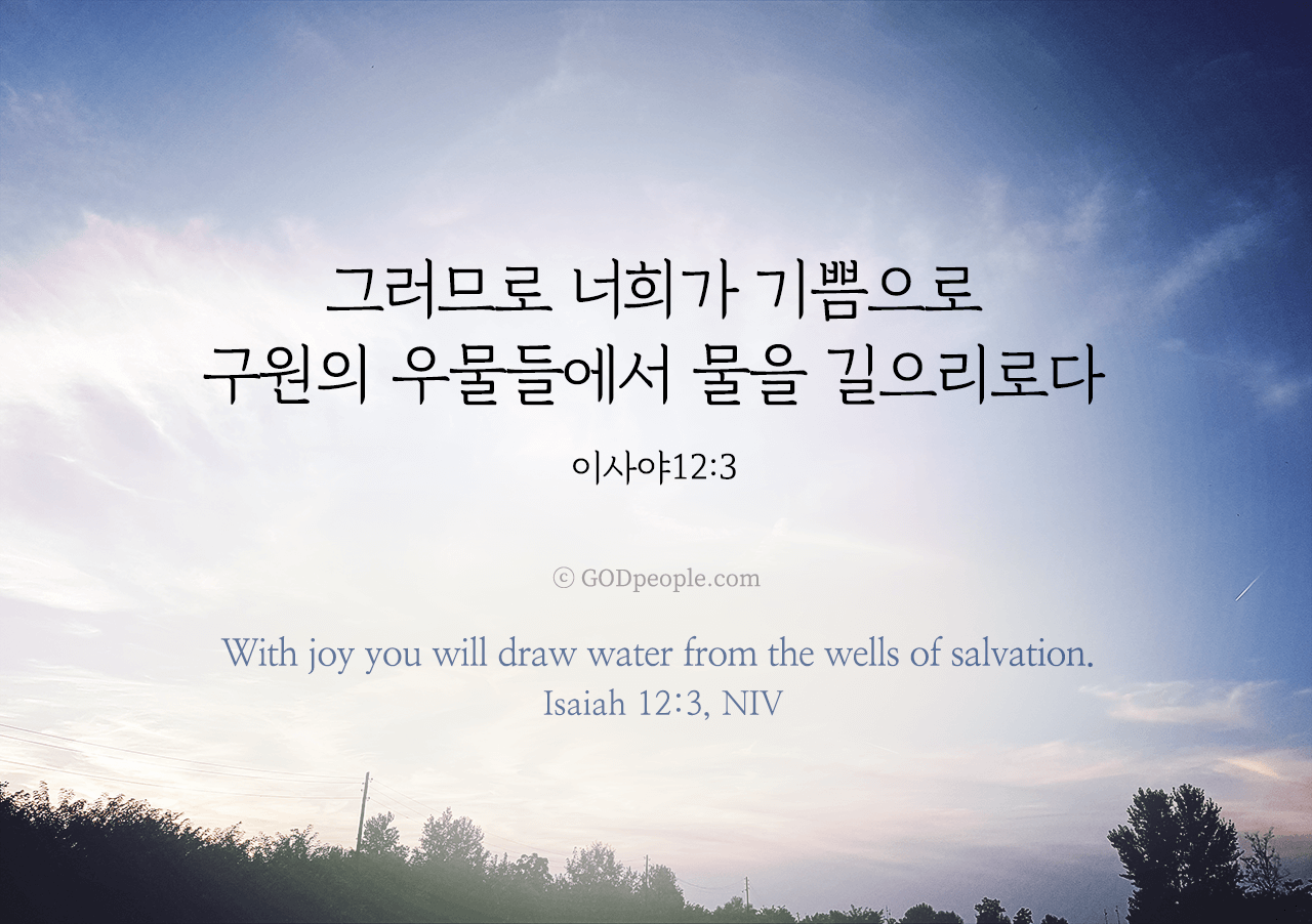그러므로 너희가 기쁨으로 구원의 우물들에서 물을 길으리로다 _이사야 12:3With joy you will draw water from the wells of salvation. _Isaiah 12:3, NIV ♥ 교도소 재소자에게 성경책을 보내드립니다. [플로잉전용상품] 재소자에게 성경책 보내기_우리말성경 단본(실버그린)우리말성경 단본 (무색인/무지퍼/페이퍼백/실버그린/DKV2406)두란노 편집부 [플로잉전용상품] 재소자에게 성경책 보내기_큰글로 읽는 우리말 비전성경 중단본(호박색)큰글로 읽는 우리말 비전성경 중단본(색인/무지퍼/PU/호박색/DKV2206)도서출판 두란노두란노 편집부 위 성경책을 구매 (플로잉 Flowing) 하시면 "프리즌 리바이벌 PRISON REVIVAL "을 통해서 국내 교정기관의 담장 안에서 지내시는 분들에게 전달됩니다.♥ 수용자 자녀에게 성경만화, 묵상365를 보내드립니다. [플로잉전용상품] 수용자 자녀에게 성경만화 보내기_만화 예수님의 생애 세트 (전3권)온 가족이 함께 보는 사복음서김동순 [플로잉전용상품] 수용자 자녀에게 성경만화 보내기_[개역개정판] 카툰성경 세트(완간/전3권)그린이 : 키이스 닐리, 데이비드 마일즈 [플로잉전용상품] 갓피플 통해 쌀 보내기_백미 (10kg)오픈스토리 [플로잉전용상품] 맛있는 반찬보내기_김치세트 (유기농백김치+겉절이)참식품주식회사 위 상품 구매 (플로잉 Flowing) 하시면 "세움"을 통해서 수용자(교도소 재소자) 자녀들에게 전달됩니다.+오늘의말씀으로 만들었어요♡ 오늘의말씀 아크릴 자석액자+말씀을 듣고 필사하세요♡ 개역개정 MP3 다운로드 | 태블릿으로 필사 | 종이노트로 필사 좋아요아멘개척교회 돕기 2025-08-20 · 5977 · 227 · 1오늘의말씀 말씀카드 이사야12장3절 전도[주의] 계좌로 도움 요청글 발견시눌러 사용자차단을 눌러주세요!댓글 0입력댓글먼저최근순등록오늘의말씀더보기갓피플 오늘의말씀_예레미야30장22절갓피플 오늘의말씀_마태복음18장22절갓피플 오늘의말씀_마태복음18장20절
