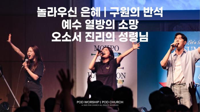 좋아요아멘개척교회 돕기 2025-08-21 · 298 · · [주의] 계좌로 도움 요청글 발견시눌러 사용자차단을 눌러주세요!댓글 0입력댓글먼저최근순등록POD Worship더보기놀라우신 은혜 / 구원의 반석 / 예수 열방의 소망 / 오소서 진리의 성령님 - 2025.08.10 POD Worship 박청비 간사 인도거리마다 기쁨으로 / 좋으신 하나님 / 주님을 맞이하며 / 진실한 예배자로 - 2025.08.03 POD Worship 이소리 간사 인도지금은 엘리야 때처럼 / 하나님 얼굴 구하는 세대 / 예수로 나의 구주 삼고 / 나의 만족과 유익을 위해 - 2025.07.27 POD Worship 박청비 간사 인도