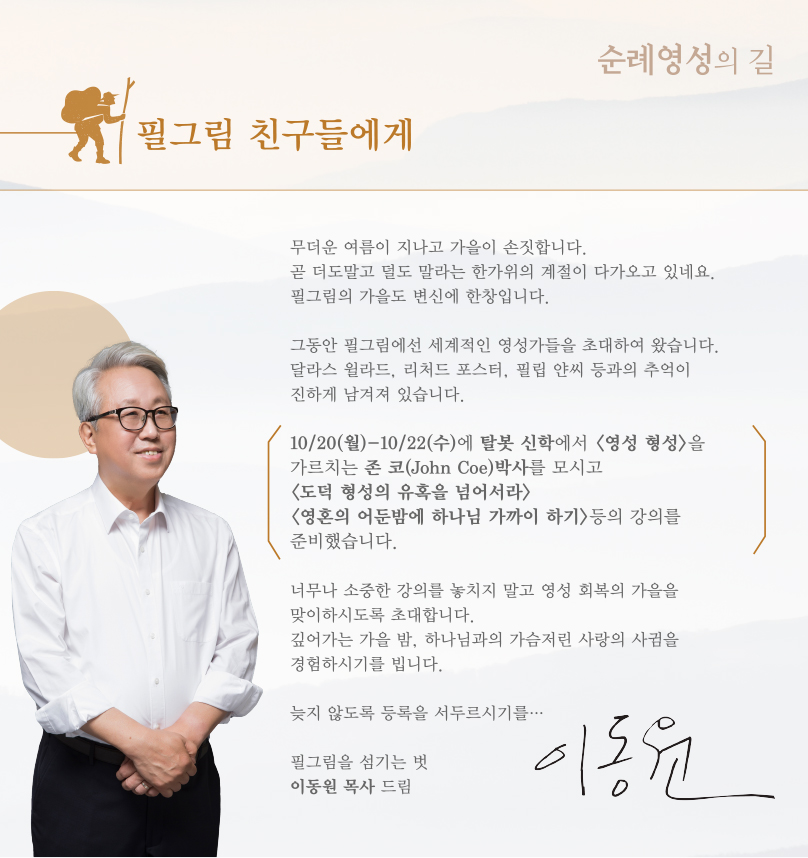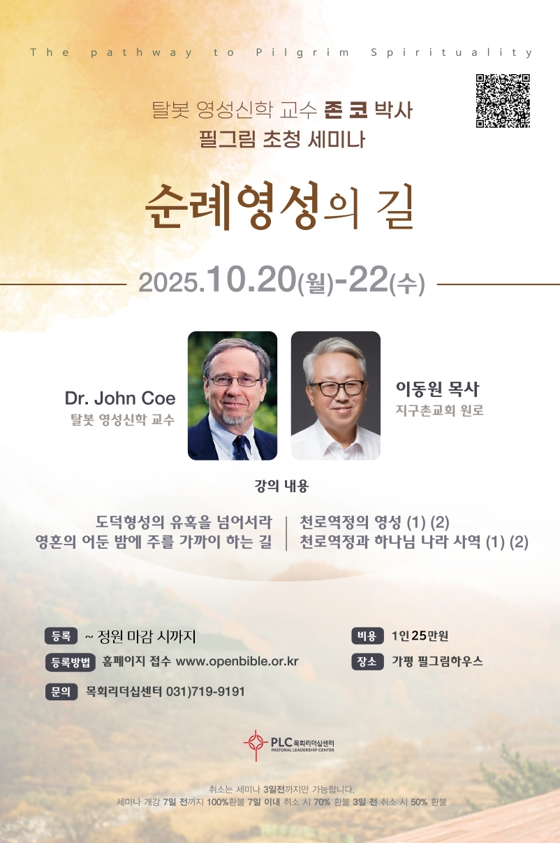 "그리스도인의 순례의 걸음을 안내하는 존 번연의 <순례자 영성>탐구와 더불어 개신교회가 잃어버린 침묵의 영성을 회복하게 되는 세미나 입니다."