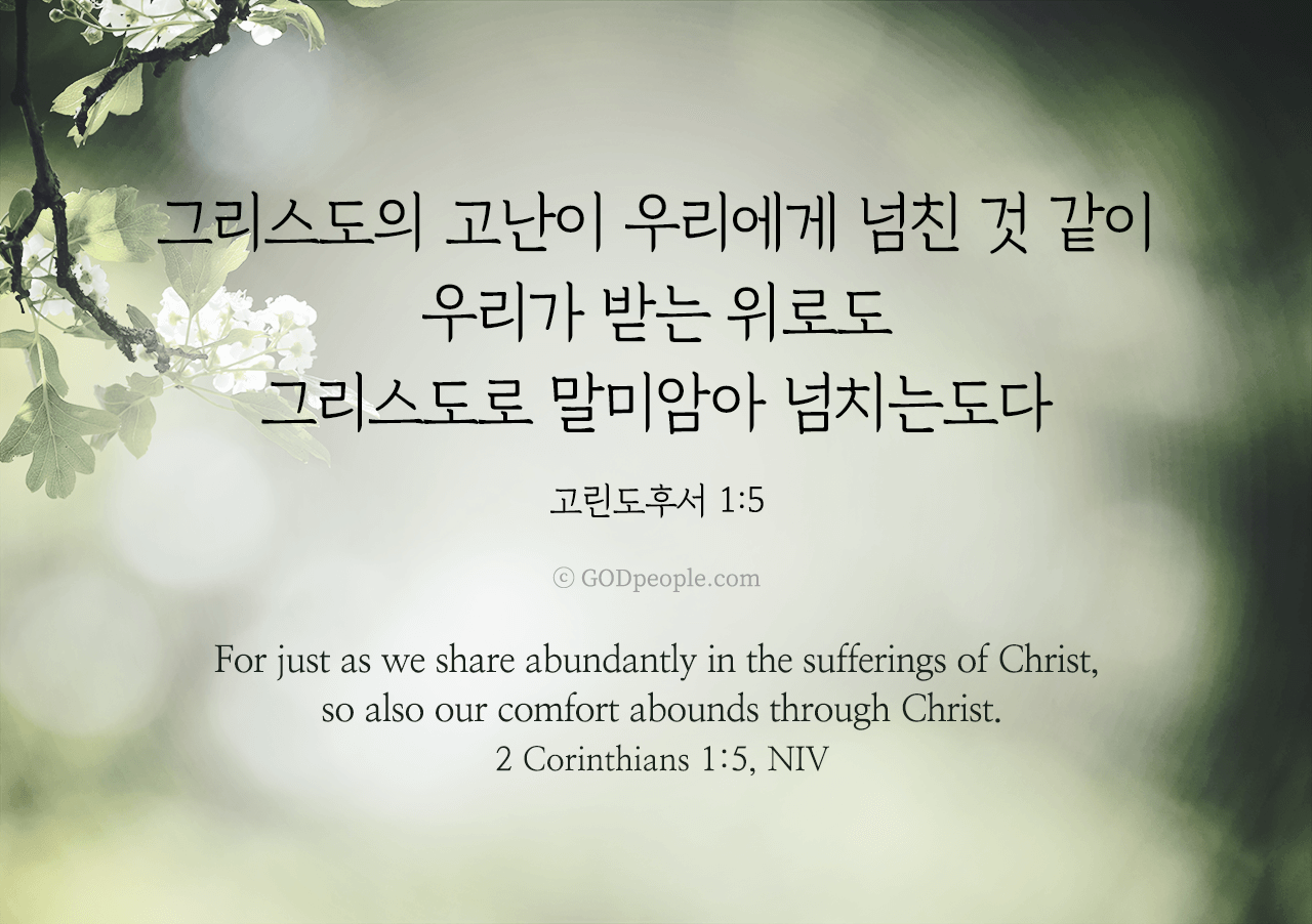 그리스도의 고난이 우리에게 넘친 것 같이 우리가 받는 위로도 그리스도로 말미암아 넘치는도다 _고린도후서 1:5For just as we share abundantly in the sufferings of Christ, so also our comfort abounds through Christ. _2 Corinthians 1:5, NIV ♥ 교도소 재소자에게 성경책을 보내드립니다. [플로잉전용상품] 재소자에게 성경책 보내기_우리말성경 단본(실버그린)우리말성경 단본 (무색인/무지퍼/페이퍼백/실버그린/DKV2406)두란노 편집부 [플로잉전용상품] 재소자에게 성경책 보내기_큰글로 읽는 우리말 비전성경 중단본(호박색)큰글로 읽는 우리말 비전성경 중단본(색인/무지퍼/PU/호박색/DKV2206)도서출판 두란노두란노 편집부 위 성경책을 구매 (플로잉 Flowing) 하시면 "프리즌 리바이벌 PRISON REVIVAL "을 통해서 국내 교정기관의 담장 안에서 지내시는 분들에게 전달됩니다.♥ 수용자 자녀에게 성경만화, 묵상365를 보내드립니다. [플로잉전용상품] 수용자 자녀에게 성경만화 보내기_만화 예수님의 생애 세트 (전3권)온 가족이 함께 보는 사복음서김동순 [플로잉전용상품] 수용자 자녀에게 성경만화 보내기_[개역개정판] 카툰성경 세트(완간/전3권)그린이 : 키이스 닐리, 데이비드 마일즈 [플로잉전용상품] 갓피플 통해 쌀 보내기_백미 (10kg)오픈스토리 [플로잉전용상품] 맛있는 반찬보내기_김치세트 (유기농백김치+겉절이)참식품주식회사 위 상품 구매 (플로잉 Flowing) 하시면 "세움"을 통해서 수용자(교도소 재소자) 자녀들에게 전달됩니다.+오늘의말씀으로 만들었어요♡ 오늘의말씀 아크릴 자석액자+말씀을 듣고 필사하세요♡ 개역개정 MP3 다운로드 | 태블릿으로 필사 | 종이노트로 필사 좋아요아멘개척교회 돕기 2025-09-18 · 6164 · 270 · 1오늘의말씀 말씀카드 고린도후서1장5절 전도[주의] 계좌로 도움 요청글 발견시눌러 사용자차단을 눌러주세요!댓글 0입력댓글먼저최근순등록오늘의말씀더보기갓피플 오늘의말씀_마태복음5장44절갓피플 오늘의말씀_로마서8장31절갓피플 오늘의말씀_잠언12장25절