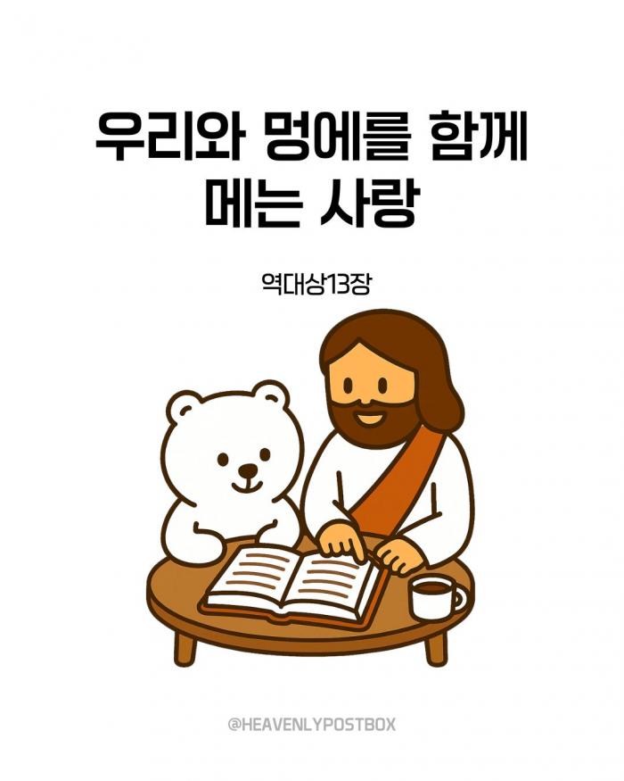 ❤️하늘우체통 큐티레터 구독하시면,매일 새벽 카톡으로 배달됩니다.(국문, 영문으로 제공)https://open.kakao.com/o/g3FUFNsh❤️하늘우체통 인스타그램https://www.instagram.com/heavenlypostbox/윤홍진 작가 작품활동 응원하기!지난 20년간 갓피플 만화는 주보 사용을 무료로 제공해왔습니다. 이제는 작가들에게 작은 정성을 표현하면 어떨까요? 주보 1회 사용시 1,000원의 자발적 결제 후 이용해주세요주보사용 자발적 결제1,000원작가에게 커피 한잔선물하기좋아요아멘개척교회 돕기 2025-09-16 · 1042 · 7 · 하늘우체통 곰팅이 만화큐티 큐티만화 일러스트묵상 그림묵상 예수님 그리스도 기독교 기독만화 경건의시간 큐티 하나님 하나님은혜 복음 복음만화 Jesus heavenlypostbox illustration quiettime devotion love drawing art daily holyspirit god[주의] 계좌로 도움 요청글 발견시눌러 사용자차단을 눌러주세요!댓글 0입력댓글먼저최근순등록곰팅이의 집_윤홍진더보기정체성에서 시작되는 친밀한 동행당신 안에 잠자고 있는 믿음의 거인을 깨우는 법우리와 멍에를 함께 메는 사랑