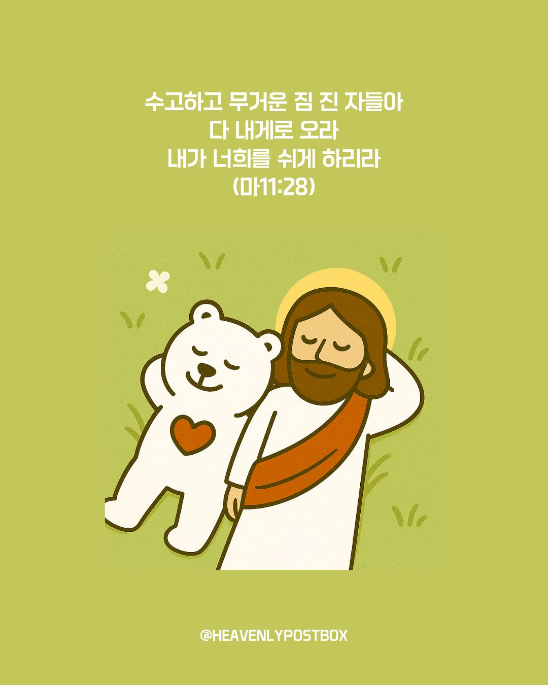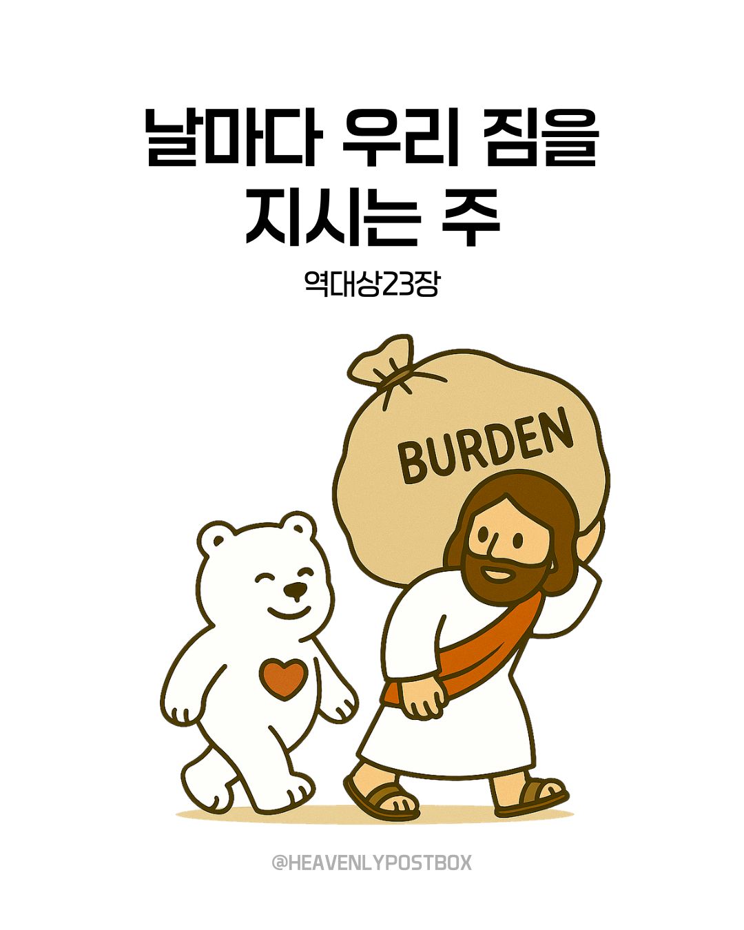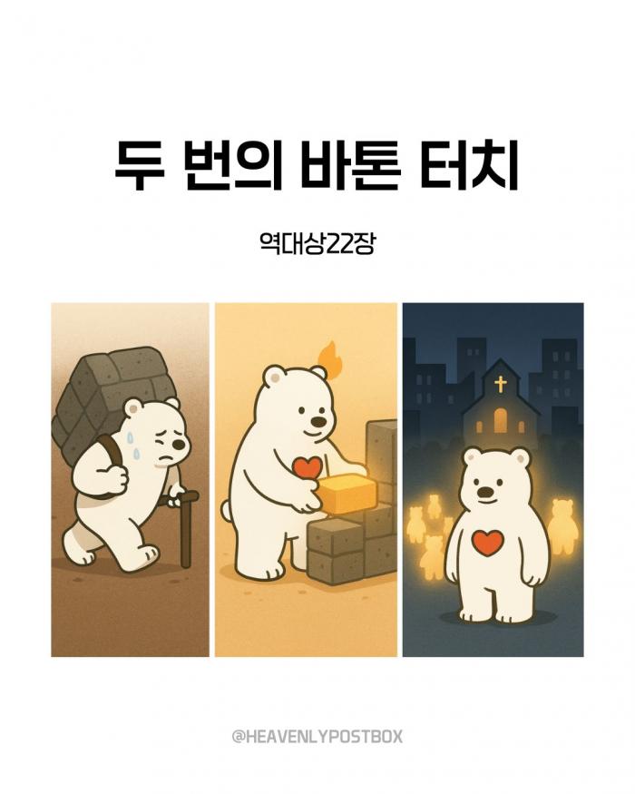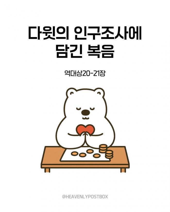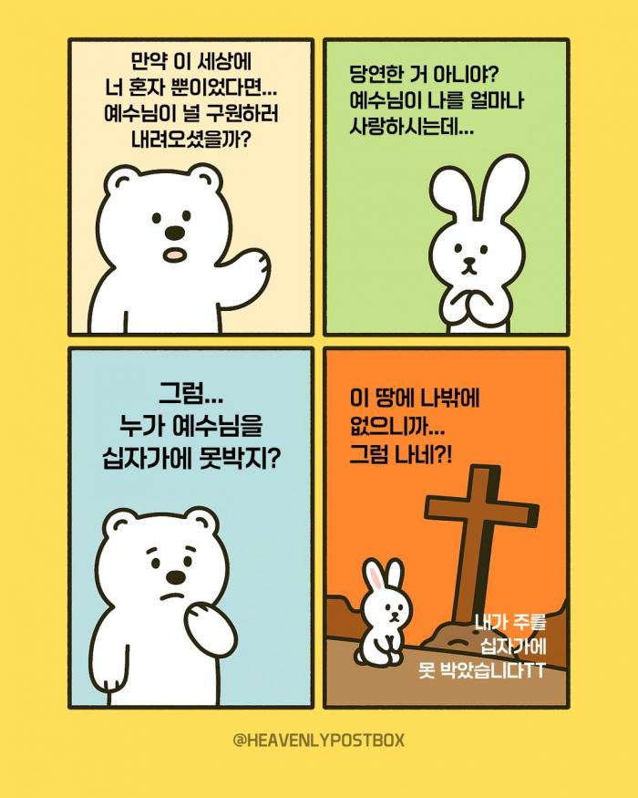 ❤️하늘우체통 큐티레터 구독하시면,매일 새벽 카톡으로 배달됩니다.(국문, 영문으로 제공)https://open.kakao.com/o/g3FUFNsh❤️하늘우체통 인스타그램https://www.instagram.com/heavenlypostbox/윤홍진 작가 작품활동 응원하기!지난 20년간 갓피플 만화는 주보 사용을 무료로 제공해왔습니다. 이제는 작가들에게 작은 정성을 표현하면 어떨까요? 주보 1회 사용시 1,000원의 자발적 결제 후 이용해주세요주보사용 자발적 결제1,000원작가에게 커피 한잔선물하기좋아요아멘개척교회 돕기 2025-09-24 · 905 · 7 · 2하늘우체통 곰팅이 만화큐티 큐티만화 일러스트묵상 그림묵상 예수님 그리스도 기독교 기독만화 경건의시간 큐티 하나님 하나님은혜 복음 복음만화 Jesus heavenlypostbox illustration quiettime devotion love drawing art daily holyspirit god[주의] 계좌로 도움 요청글 발견시눌러 사용자차단을 눌러주세요!댓글 0입력댓글먼저최근순등록곰팅이의 집_윤홍진더보기두 번의 바톤 터치내가 주를 십자가에 못박았나이다다윗의 인구조사에 담긴 복음