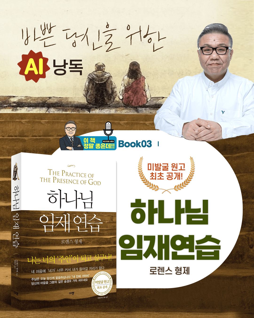 이번에 다룰 책은 특별히 미발굴 원고를 최초로 담아 더욱 귀한 의미를 지닙니다. 오늘 함께 나눌 책은 로렌스 형제의 고전 『하나님 임재 연습』입니다. 🙏