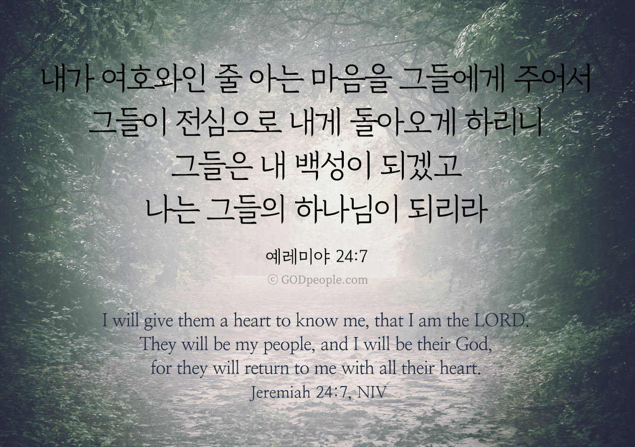 내가 여호와인 줄 아는 마음을 그들에게 주어서 그들이 전심으로 내게 돌아오게 하리니 그들은 내 백성이 되겠고 나는 그들의 하나님이 되리라 _예레미야 24:7