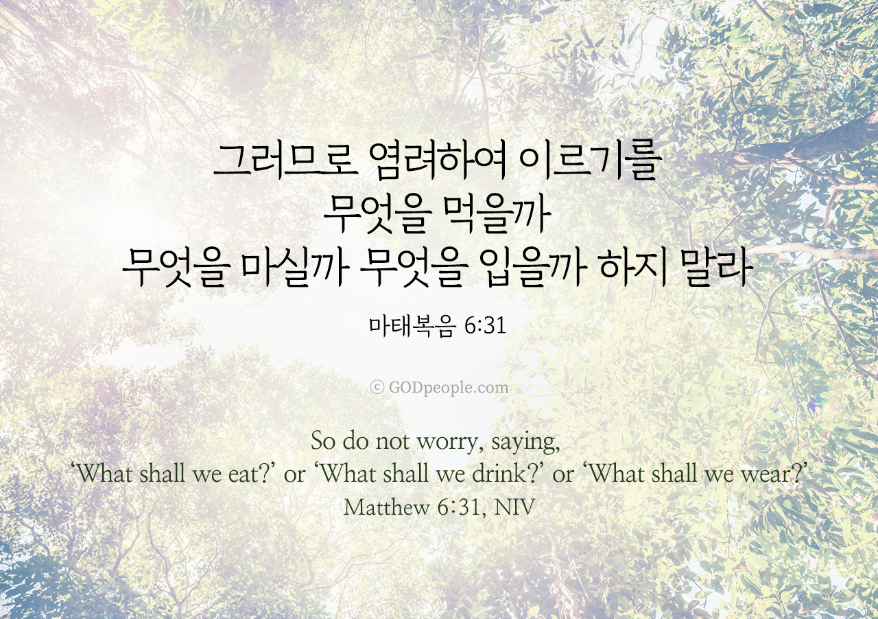 그러므로 염려하여 이르기를 무엇을 먹을까 무엇을 마실까 무엇을 입을까 하지 말라 _마태복음 6:31So do not worry, saying, 'What shall we eat?' or 'What shall we drink?' or 'What shall we wear?' _Matthew 6:31, NIV ♥ 교도소 재소자에게 성경책을 보내드립니다. [플로잉전용상품] 재소자에게 성경책 보내기_우리말성경 단본(실버그린)우리말성경 단본 (무색인/무지퍼/페이퍼백/실버그린/DKV2406)두란노 편집부 [플로잉전용상품] 재소자에게 성경책 보내기_큰글로 읽는 우리말 비전성경 중단본(호박색)큰글로 읽는 우리말 비전성경 중단본(색인/무지퍼/PU/호박색/DKV2206)도서출판 두란노두란노 편집부 위 성경책을 구매 (플로잉 Flowing) 하시면 "프리즌 리바이벌 PRISON REVIVAL "을 통해서 국내 교정기관의 담장 안에서 지내시는 분들에게 전달됩니다.♥ 수용자 자녀에게 성경만화, 묵상365를 보내드립니다. [플로잉전용상품] 수용자 자녀에게 성경만화 보내기_만화 예수님의 생애 세트 (전3권)온 가족이 함께 보는 사복음서김동순 [플로잉전용상품] 수용자 자녀에게 성경만화 보내기_[개역개정판] 카툰성경 세트(완간/전3권)그린이 : 키이스 닐리, 데이비드 마일즈 [플로잉전용상품] 갓피플 통해 쌀 보내기_백미 (10kg)오픈스토리 [플로잉전용상품] 맛있는 반찬보내기_김치세트 (유기농백김치+겉절이)참식품주식회사 위 상품 구매 (플로잉 Flowing) 하시면 "세움"을 통해서 수용자(교도소 재소자) 자녀들에게 전달됩니다.+오늘의말씀으로 만들었어요♡ 오늘의말씀 아크릴 자석액자+말씀을 듣고 필사하세요♡ 개역개정 MP3 다운로드 | 태블릿으로 필사 | 종이노트로 필사 좋아요아멘개척교회 돕기 2025-10-06 · 3759 · 160 · 오늘의말씀 말씀카드 마태복음6장31절 전도식물더보기주의 말씀대로 주의 말씀대로 주의 말씀대로