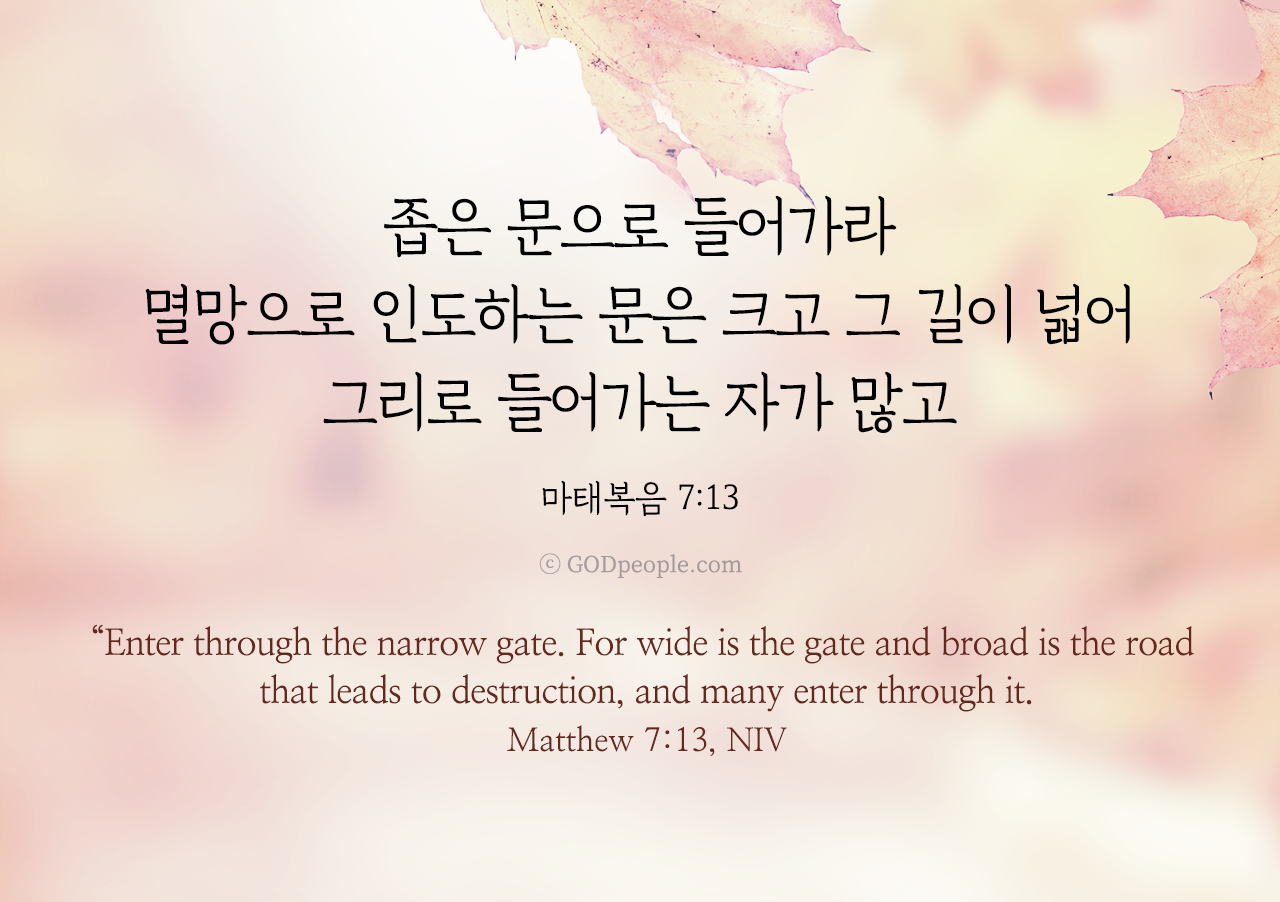 좁은 문으로 들어가라 멸망으로 인도하는 문은 크고 그 길이 넓어 그리로 들어가는 자가 많고 _마태복음 7:13"Enter through the narrow gate. For wide is the gate and broad is the road that leads to destruction, and many enter through it. _Matthew 7:13, NIV ♥ 교도소 재소자에게 성경책을 보내드립니다. [플로잉전용상품] 재소자에게 성경책 보내기_우리말성경 단본(실버그린)우리말성경 단본 (무색인/무지퍼/페이퍼백/실버그린/DKV2406)두란노 편집부 [플로잉전용상품] 재소자에게 성경책 보내기_큰글로 읽는 우리말 비전성경 중단본(호박색)큰글로 읽는 우리말 비전성경 중단본(색인/무지퍼/PU/호박색/DKV2206)도서출판 두란노두란노 편집부 위 성경책을 구매 (플로잉 Flowing) 하시면 "프리즌 리바이벌 PRISON REVIVAL "을 통해서 국내 교정기관의 담장 안에서 지내시는 분들에게 전달됩니다.♥ 수용자 자녀에게 성경만화, 묵상365를 보내드립니다. [플로잉전용상품] 수용자 자녀에게 성경만화 보내기_만화 예수님의 생애 세트 (전3권)온 가족이 함께 보는 사복음서김동순 [플로잉전용상품] 수용자 자녀에게 성경만화 보내기_[개역개정판] 카툰성경 세트(완간/전3권)그린이 : 키이스 닐리, 데이비드 마일즈 [플로잉전용상품] 갓피플 통해 쌀 보내기_백미 (10kg)오픈스토리 [플로잉전용상품] 맛있는 반찬보내기_김치세트 (유기농백김치+겉절이)참식품주식회사 위 상품 구매 (플로잉 Flowing) 하시면 "세움"을 통해서 수용자(교도소 재소자) 자녀들에게 전달됩니다.+오늘의말씀으로 만들었어요♡ 오늘의말씀 아크릴 자석액자+말씀을 듣고 필사하세요♡ 개역개정 MP3 다운로드 | 태블릿으로 필사 | 종이노트로 필사 좋아요아멘개척교회 돕기 2025-10-08 · 3873 · 158 · 오늘의말씀 말씀카드 마태복음7장13절 전도오늘의말씀더보기갓피플 오늘의말씀_시편37편4절갓피플 오늘의말씀_시편25편6절갓피플 오늘의말씀_시편25편4절