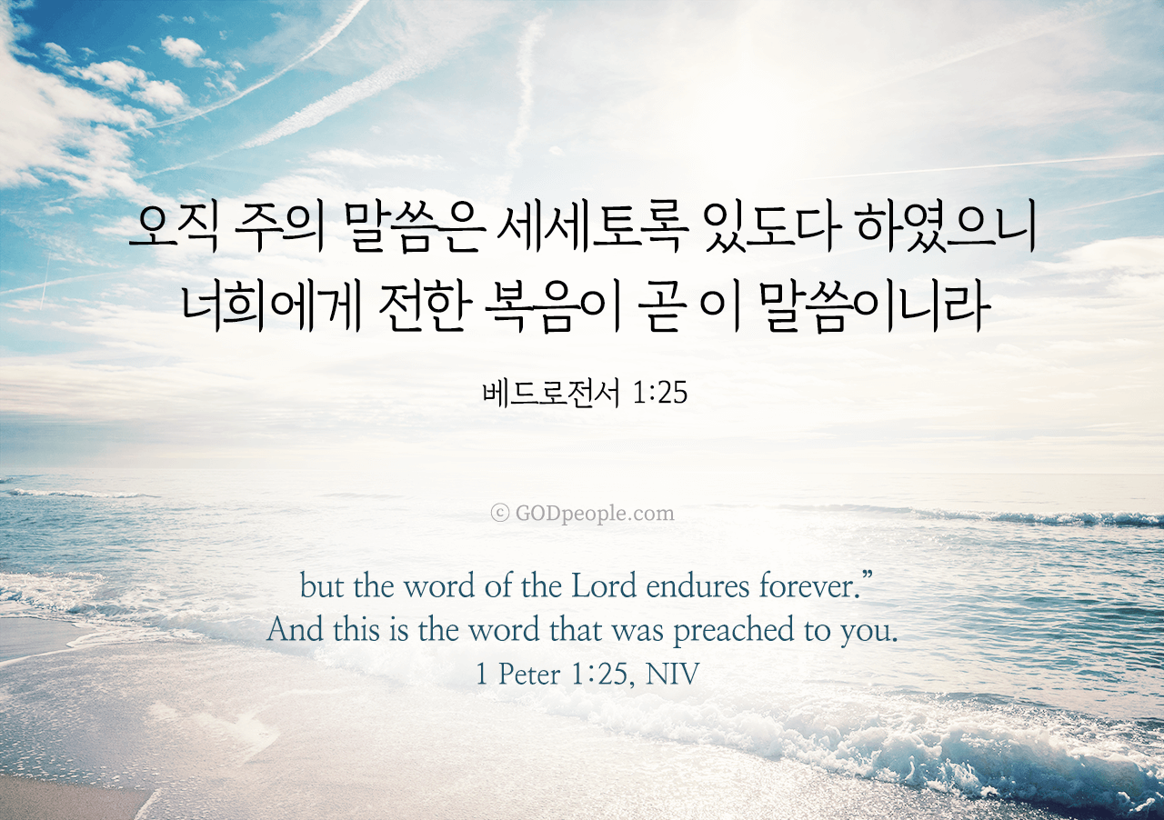 오직 주의 말씀은 세세토록 있도다 하였으니 너희에게 전한 복음이 곧 이 말씀이니라 _베드로전서 1:25but the word of the Lord endures forever."And this is the word that was preached to you. _1 Peter 1:25, NIV ♥ 교도소 재소자에게 성경책을 보내드립니다. [플로잉전용상품] 재소자에게 성경책 보내기_우리말성경 단본(실버그린)우리말성경 단본 (무색인/무지퍼/페이퍼백/실버그린/DKV2406)두란노 편집부 [플로잉전용상품] 재소자에게 성경책 보내기_큰글로 읽는 우리말 비전성경 중단본(호박색)큰글로 읽는 우리말 비전성경 중단본(색인/무지퍼/PU/호박색/DKV2206)도서출판 두란노두란노 편집부 위 성경책을 구매 (플로잉 Flowing) 하시면 "프리즌 리바이벌 PRISON REVIVAL "을 통해서 국내 교정기관의 담장 안에서 지내시는 분들에게 전달됩니다.♥ 수용자 자녀에게 성경만화, 묵상365를 보내드립니다. [플로잉전용상품] 수용자 자녀에게 성경만화 보내기_만화 예수님의 생애 세트 (전3권)온 가족이 함께 보는 사복음서김동순 [플로잉전용상품] 수용자 자녀에게 성경만화 보내기_[개역개정판] 카툰성경 세트(완간/전3권)그린이 : 키이스 닐리, 데이비드 마일즈 [플로잉전용상품] 갓피플 통해 쌀 보내기_백미 (10kg)오픈스토리 [플로잉전용상품] 맛있는 반찬보내기_김치세트 (유기농백김치+겉절이)참식품주식회사 위 상품 구매 (플로잉 Flowing) 하시면 "세움"을 통해서 수용자(교도소 재소자) 자녀들에게 전달됩니다.+오늘의말씀으로 만들었어요♡ 오늘의말씀 아크릴 자석액자+말씀을 듣고 필사하세요♡ 개역개정 MP3 다운로드 | 태블릿으로 필사 | 종이노트로 필사 좋아요아멘개척교회 돕기 2025-11-12 · 2463 · 214 · 1오늘의말씀 말씀카드 베드로전서1장25절 전도[주의] 계좌로 도움 요청글 발견시눌러 사용자차단을 눌러주세요!댓글 0입력댓글먼저최근순등록오늘의말씀더보기갓피플 오늘의말씀_에베소서6장17절갓피플 오늘의말씀_에베소서4장4절갓피플 오늘의말씀_에베소서4장4절