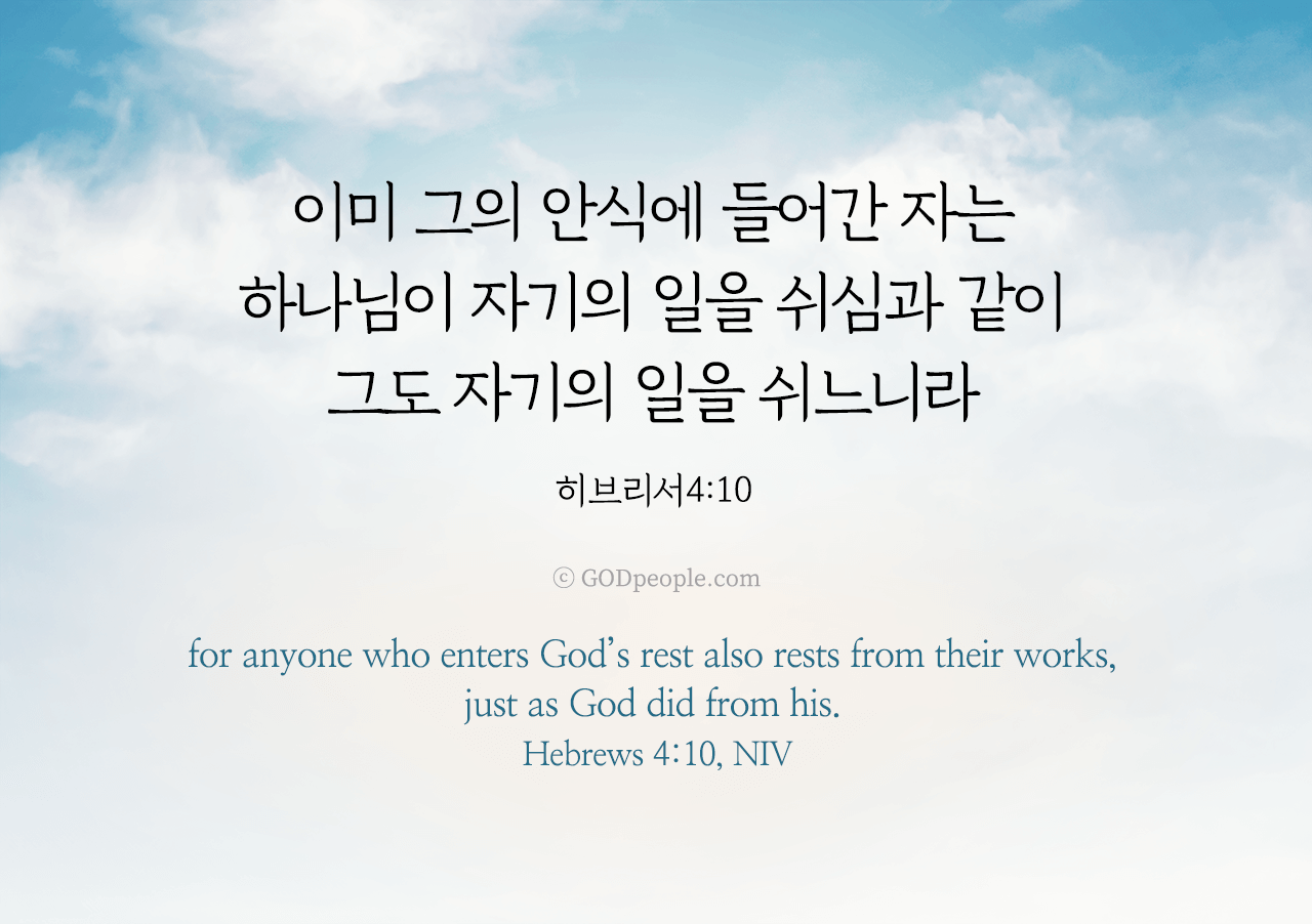 이미 그의 안식에 들어간 자는 하나님이 자기의 일을 쉬심과 같이 그도 자기의 일을 쉬느니라 _히브리서 4:10for anyone who enters God's rest also rests from their works, just as God did from his. _Hebrews 4:10, NIV ♥ 교도소 재소자에게 성경책을 보내드립니다. [플로잉전용상품] 재소자에게 성경책 보내기_우리말성경 단본(실버그린)우리말성경 단본 (무색인/무지퍼/페이퍼백/실버그린/DKV2406)두란노 편집부 [플로잉전용상품] 재소자에게 성경책 보내기_큰글로 읽는 우리말 비전성경 중단본(호박색)큰글로 읽는 우리말 비전성경 중단본(색인/무지퍼/PU/호박색/DKV2206)도서출판 두란노두란노 편집부 위 성경책을 구매 (플로잉 Flowing) 하시면 "프리즌 리바이벌 PRISON REVIVAL "을 통해서 국내 교정기관의 담장 안에서 지내시는 분들에게 전달됩니다.♥ 수용자 자녀에게 성경만화, 묵상365를 보내드립니다. [플로잉전용상품] 수용자 자녀에게 성경만화 보내기_만화 예수님의 생애 세트 (전3권)온 가족이 함께 보는 사복음서김동순 [플로잉전용상품] 수용자 자녀에게 성경만화 보내기_[개역개정판] 카툰성경 세트(완간/전3권)그린이 : 키이스 닐리, 데이비드 마일즈 [플로잉전용상품] 갓피플 통해 쌀 보내기_백미 (10kg)오픈스토리 [플로잉전용상품] 맛있는 반찬보내기_김치세트 (유기농백김치+겉절이)참식품주식회사 위 상품 구매 (플로잉 Flowing) 하시면 "세움"을 통해서 수용자(교도소 재소자) 자녀들에게 전달됩니다.+오늘의말씀으로 만들었어요♡ 오늘의말씀 아크릴 자석액자+말씀을 듣고 필사하세요♡ 개역개정 MP3 다운로드 | 태블릿으로 필사 | 종이노트로 필사 좋아요아멘개척교회 돕기 2025-12-10 · 2546 · 260 · 1오늘의말씀 말씀카드 히브리서4장10절 전도[주의] 계좌로 도움 요청글 발견시눌러 사용자차단을 눌러주세요!댓글 0입력댓글먼저최근순등록오늘의말씀더보기갓피플 오늘의말씀_히브리서3장14절갓피플 오늘의말씀_요한복음4장24절갓피플 오늘의말씀_요한복음4장23절