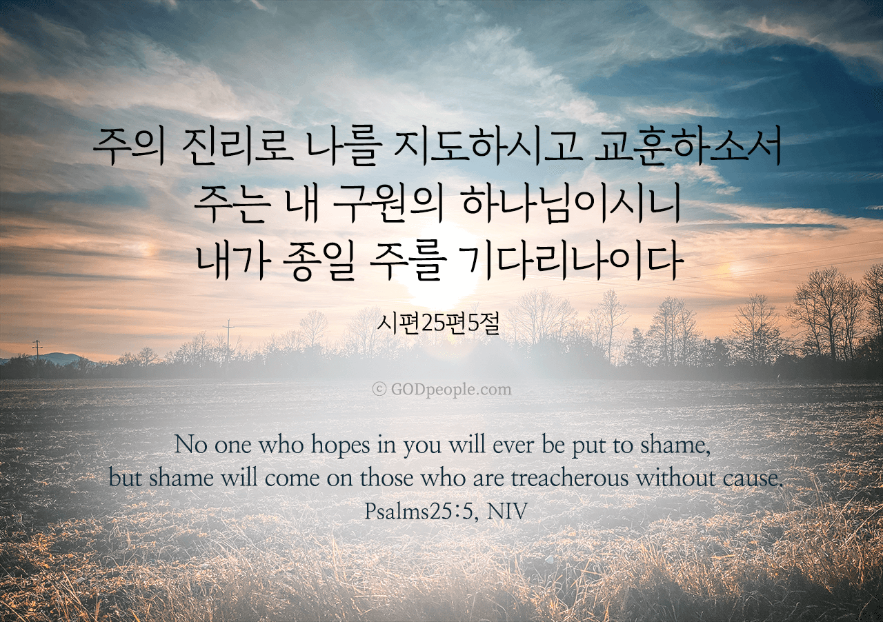 주의 진리로 나를 지도하시고 교훈하소서 주는 내 구원의 하나님이시니 내가 종일 주를 기다리나이다 _시편 25:5Guide me in your truth and teach me, for you are God my Savior, and my hope is in you all day long. _Psalms 25:5, NIV ♥ 교도소 재소자에게 성경책을 보내드립니다. [플로잉전용상품] 재소자에게 성경책 보내기_우리말성경 단본(실버그린)우리말성경 단본 (무색인/무지퍼/페이퍼백/실버그린/DKV2406)두란노 편집부 [플로잉전용상품] 재소자에게 성경책 보내기_큰글로 읽는 우리말 비전성경 중단본(호박색)큰글로 읽는 우리말 비전성경 중단본(색인/무지퍼/PU/호박색/DKV2206)도서출판 두란노두란노 편집부 위 성경책을 구매 (플로잉 Flowing) 하시면 "프리즌 리바이벌 PRISON REVIVAL "을 통해서 국내 교정기관의 담장 안에서 지내시는 분들에게 전달됩니다.♥ 수용자 자녀에게 성경만화, 묵상365를 보내드립니다. [플로잉전용상품] 수용자 자녀에게 성경만화 보내기_만화 예수님의 생애 세트 (전3권)온 가족이 함께 보는 사복음서김동순 [플로잉전용상품] 수용자 자녀에게 성경만화 보내기_[개역개정판] 카툰성경 세트(완간/전3권)그린이 : 키이스 닐리, 데이비드 마일즈 [플로잉전용상품] 갓피플 통해 쌀 보내기_백미 (10kg)오픈스토리 [플로잉전용상품] 맛있는 반찬보내기_김치세트 (유기농백김치+겉절이)참식품주식회사 위 상품 구매 (플로잉 Flowing) 하시면 "세움"을 통해서 수용자(교도소 재소자) 자녀들에게 전달됩니다.+오늘의말씀으로 만들었어요♡ 오늘의말씀 아크릴 자석액자+말씀을 듣고 필사하세요♡ 개역개정 MP3 다운로드 | 태블릿으로 필사 | 종이노트로 필사 좋아요아멘개척교회 돕기 2025-12-22 · 2829 · 295 · 1오늘의말씀 말씀카드 시편25편5절 전도[주의] 계좌로 도움 요청글 발견시눌러 사용자차단을 눌러주세요!댓글 0입력댓글먼저최근순등록오늘의말씀더보기갓피플 오늘의말씀_시편25편4절갓피플 오늘의말씀_시편25편3절갓피플 오늘의말씀_로마서1장2절