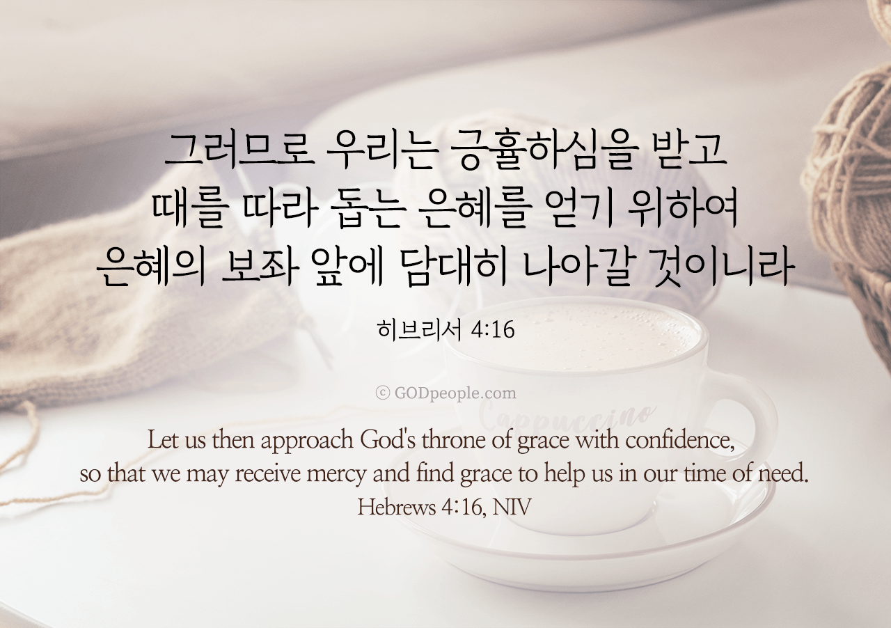 그러므로 우리는 긍휼하심을 받고 때를 따라 돕는 은혜를 얻기 위하여 은혜의 보좌 앞에 담대히 나아갈 것이니라 _히브리서 4:16Let us then approach God's throne of grace with confidence, so that we may receive mercy and find grace to help us in our time of need. _Hebrews 4:16, NIV ♥ 교도소 재소자에게 성경책을 보내드립니다. [플로잉전용상품] 재소자에게 성경책 보내기_우리말성경 단본(실버그린)우리말성경 단본 (무색인/무지퍼/페이퍼백/실버그린/DKV2406)두란노 편집부 [플로잉전용상품] 재소자에게 성경책 보내기_큰글로 읽는 우리말 비전성경 중단본(호박색)큰글로 읽는 우리말 비전성경 중단본(색인/무지퍼/PU/호박색/DKV2206)도서출판 두란노두란노 편집부 위 성경책을 구매 (플로잉 Flowing) 하시면 "프리즌 리바이벌 PRISON REVIVAL "을 통해서 국내 교정기관의 담장 안에서 지내시는 분들에게 전달됩니다.♥ 수용자 자녀에게 성경만화, 묵상365를 보내드립니다. [플로잉전용상품] 수용자 자녀에게 성경만화 보내기_만화 예수님의 생애 세트 (전3권)온 가족이 함께 보는 사복음서김동순 [플로잉전용상품] 수용자 자녀에게 성경만화 보내기_[개역개정판] 카툰성경 세트(완간/전3권)그린이 : 키이스 닐리, 데이비드 마일즈 [플로잉전용상품] 갓피플 통해 쌀 보내기_백미 (10kg)오픈스토리 [플로잉전용상품] 맛있는 반찬보내기_김치세트 (유기농백김치+겉절이)참식품주식회사 위 상품 구매 (플로잉 Flowing) 하시면 "세움"을 통해서 수용자(교도소 재소자) 자녀들에게 전달됩니다.+오늘의말씀으로 만들었어요♡ 오늘의말씀 아크릴 자석액자+말씀을 듣고 필사하세요♡ 개역개정 MP3 다운로드 | 태블릿으로 필사 | 종이노트로 필사 좋아요아멘개척교회 돕기 2025-12-28 · 2442 · 194 · 오늘의말씀 말씀카드 히브리서4장16절 전도[주의] 계좌로 도움 요청글 발견시눌러 사용자차단을 눌러주세요!댓글 0입력댓글먼저최근순등록오늘의말씀더보기갓피플 오늘의말씀_잠언29장25절갓피플 오늘의말씀_누가복음7장19절갓피플 오늘의말씀_누가복음2장11절