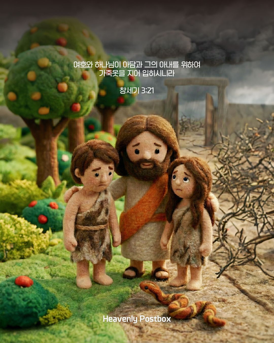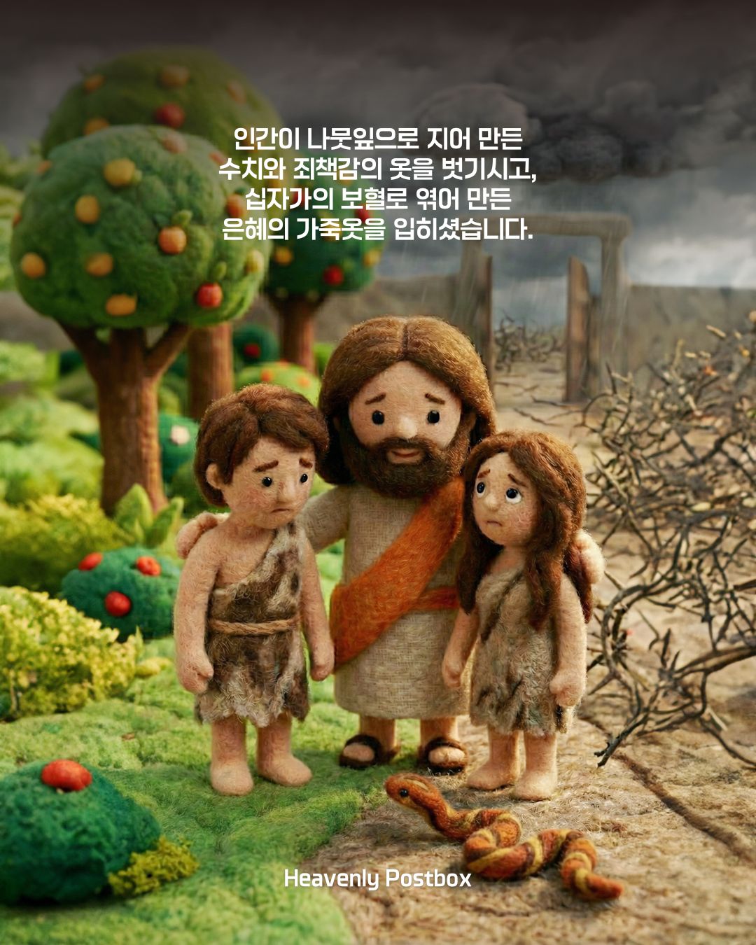 아담과 하와를 에덴동산에서 내 보내실 때에... 하나님의 마음은 분노가 아니었습니다. 앞으로 그들이 걸어가야 할 고단하고 혹독한 가시밭길을 불쌍히 여기시고 가죽옷을 지어 입히시는 따뜻한 배려를 보이셨습니다. 짐승의 피를 흘려 만든 이 가죽옷은, 장차 인간의 죄를 위해 피 흘리실 예수님의 구원을 기억하라는 사랑의 표식이었습니다. 반면, 사탄은 우리에게 행위와 조건의 옷을 입혀 끊임없이 우리를 정죄하고 죄책감이라는 감옥에 가두려고 합니다. 하지만 하나님은 독생자의 보혈과 성령의 임재로 수놓아 만든 조건없는 아가페 사랑의 옷을 지어 입히셔서 우리가 누구인지 기억하며 살아갈 것을 명하셨습니다.