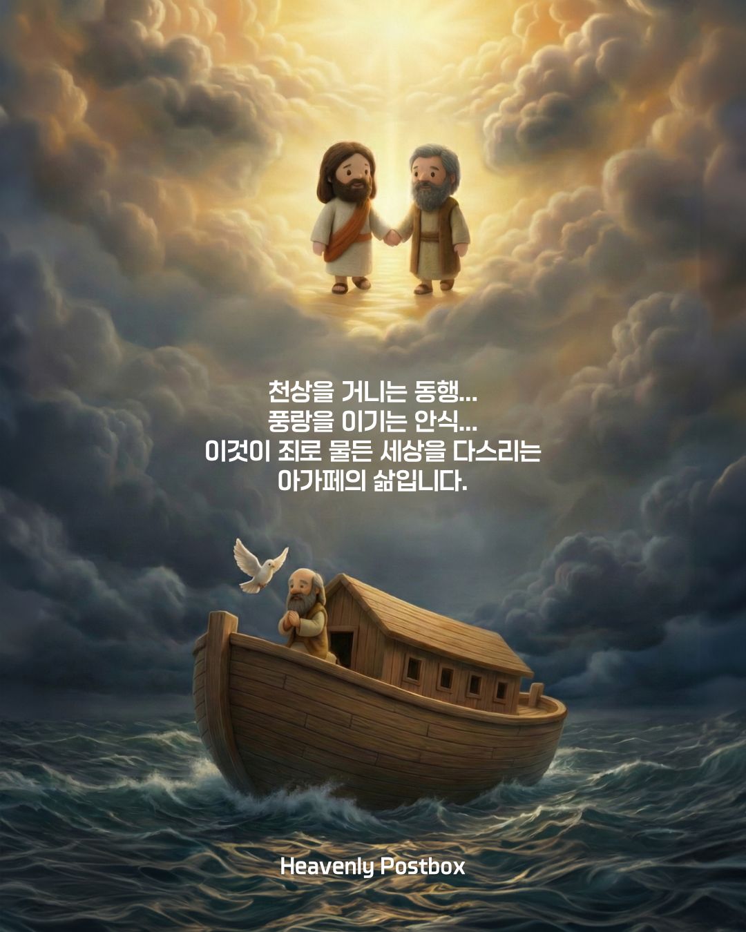 - 우리의 <혼과 몸>은 노아와 같습니다 : 심판과 고통의 물결이 출렁이는 세상 위에 떠 있지만, 내 인생의 노와 키를 내려놓고 오직 말씀의 인도함을 받는 '초월적 삶'을 사는 것입니다.
