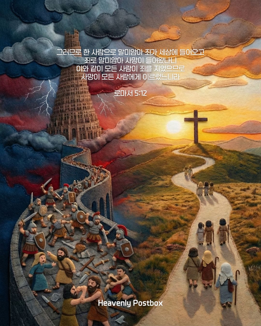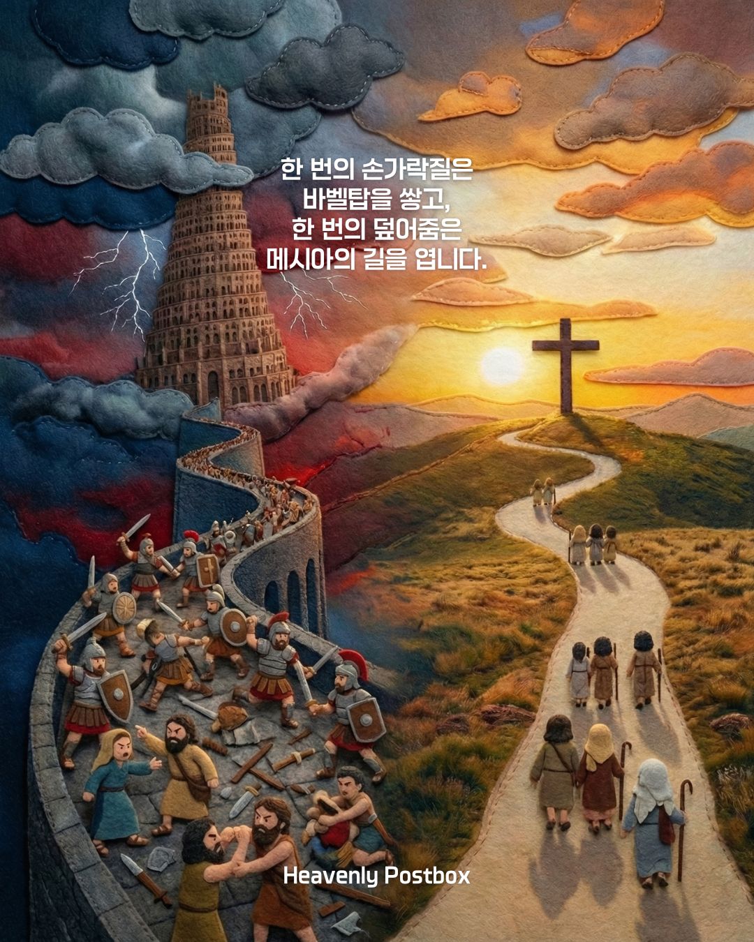 이 사건은 앞으로 흘러가게 될 두가지 물줄기를 보여줍니다. 아버지의 잘못을 덮어주지 않고 <율법>적으로 판단하고 정죄하며 손가락질했던 함의 자손들 중에 구스가 났고 구스의 아들인 니므롯이 인류 첫번째 왕이 되어 바벨이라는 나라(사탄의 왕국)를 건설합니다. 그는 선과 악을 스스로 결정하고 집행하며 하나님의 왕권을 거부하고 스스로 왕이 되었고, 결국 훗날 그의 후손들은 '바벨탑'이라는 교만의 끝을 보여주는 성을 쌓아 하나님을 철저히 대적하게 됩니다. 반면 아버지의 허물을 덮어주는 <은혜>의 태도를 취한 셈의 후손으로부터 데라가 났고 데라의 아들인 아브람이 태어나 인류를 죄로부터 구원할 약속의 씨가 되어 하나님 나라를 건설하는 첫단추가 됩니다. 결국 훗날 그의 후손으로부터 다윗이 나고 온 인류를 구원할 만왕의 왕 예수 그리스도께서 성육신하여 내려오시는 놀라운 축복의 통로로 쓰임받게 됩니다.