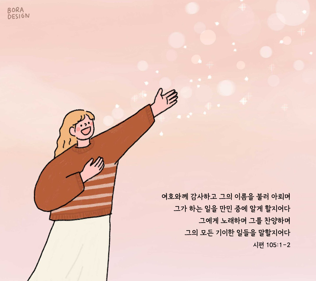 여호와께 감사하고 그의 이름을 불러 아뢰며 그가 하는 일을 만민 중에 알게 할지어다 그에게 노래하며 그를 찬양하며 그의 모든 기이한 일들을 말할지어다 _시편 105: 1~2 이보라 작가 작품활동 응원하기!지난 20년간 갓피플 만화는 주보 사용을 무료로 제공해왔습니다. 이제는 작가들에게 작은 정성을 표현하면 어떨까요? 주보 1회 사용시 1,000원의 자발적 결제 후 이용해주세요주보사용 자발적 결제1,000원작가에게 커피 한잔선물하기좋아요아멘개척교회 돕기 2026-01-22 · 398 · 8 · 2기도사랑하나님예수님믿음복음찬양감사시편주보만화[주의] 계좌로 도움 요청글 발견시눌러 사용자차단을 눌러주세요!댓글 0입력댓글먼저최근순등록Every moment diary_이보라더보기빛의 열매는아빠 아버지최고의 선물