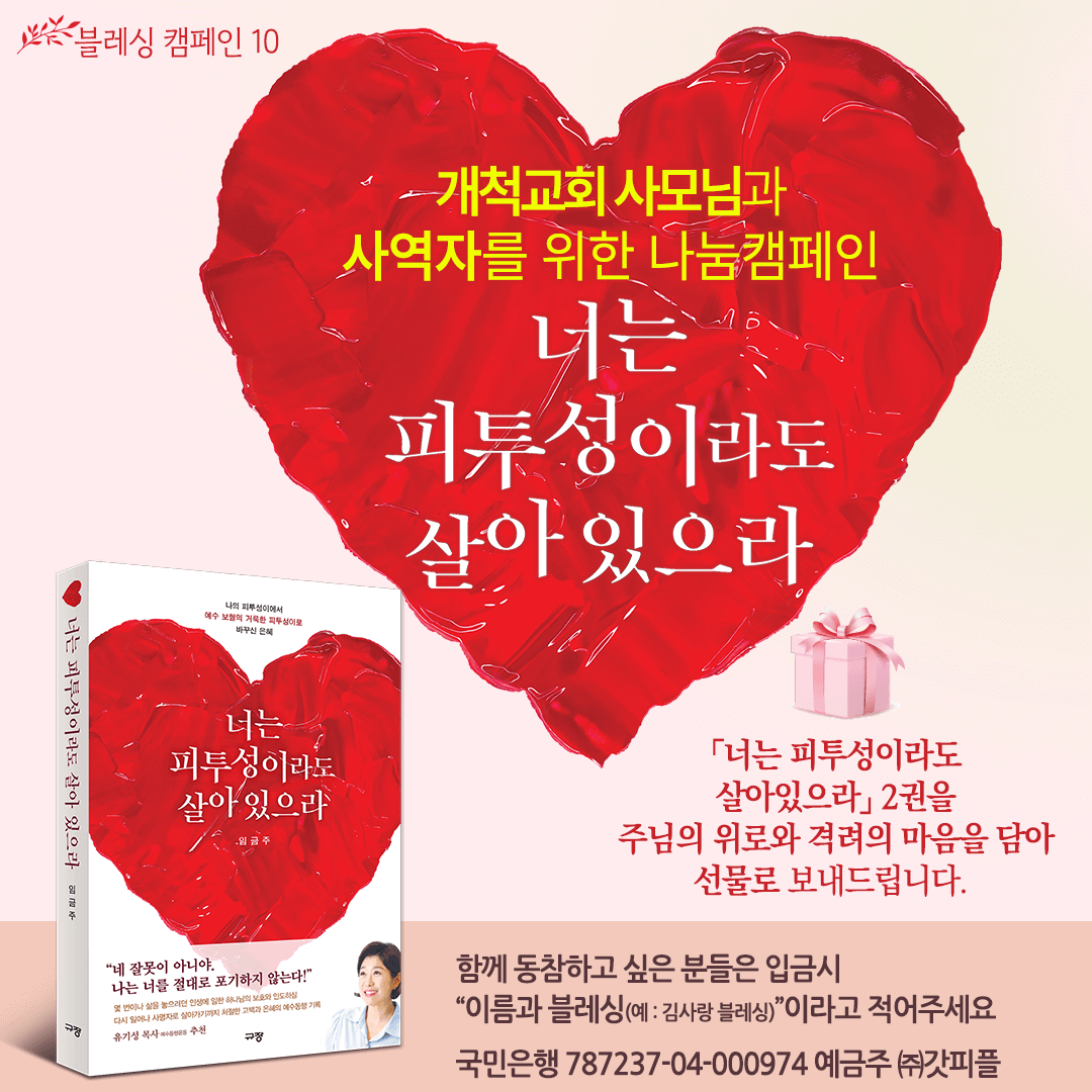 너는 살아만 있어 달라시는(겔 16:6) 하나님의 당부대로 살아내기 위해 몸부림친 저자는 하나님의 기쁨이 되고 싶다는 갈망으로 끝내 십자가를 붙잡고 다시 일어섰다. 나의 피투성이에서 예수 보혈의 거룩한 피투성이로 변화되기까지 신실하게 인도하신 하나님과의 이야기가 약 10년의 일기에 담겨, 2025년 예수동행일기 공모전에서 1등을 수상하기도 했다.