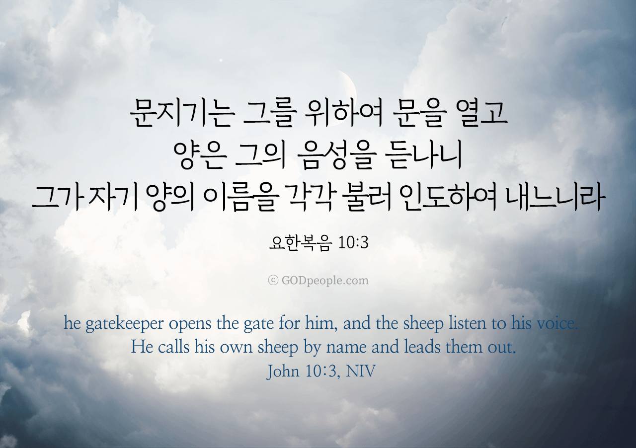 문지기는 그를 위하여 문을 열고 양은 그의 음성을 듣나니 그가 자기 양의 이름을 각각 불러 인도하여 내느니라 _요한복음 10:3The gatekeeper opens the gate for him, and the sheep listen to his voice. He calls his own sheep by name and leads them out. _John 10:3, NIV ♥ 교도소 재소자에게 성경책을 보내드립니다. [플로잉전용상품] 재소자에게 성경책 보내기_우리말성경 단본(실버그린)우리말성경 단본 (무색인/무지퍼/페이퍼백/실버그린/DKV2406)두란노 편집부 [플로잉전용상품] 재소자에게 성경책 보내기_큰글로 읽는 우리말 비전성경 중단본(호박색)큰글로 읽는 우리말 비전성경 중단본(색인/무지퍼/PU/호박색/DKV2206)도서출판 두란노두란노 편집부 위 성경책을 구매 (플로잉 Flowing) 하시면 "프리즌 리바이벌 PRISON REVIVAL "을 통해서 국내 교정기관의 담장 안에서 지내시는 분들에게 전달됩니다.♥ 수용자 자녀에게 성경만화, 묵상365를 보내드립니다. [플로잉전용상품] 수용자 자녀에게 성경만화 보내기_만화 예수님의 생애 세트 (전3권)온 가족이 함께 보는 사복음서김동순 [플로잉전용상품] 수용자 자녀에게 성경만화 보내기_[개역개정판] 카툰성경 세트(완간/전3권)그린이 : 키이스 닐리, 데이비드 마일즈 [플로잉전용상품] 갓피플 통해 쌀 보내기_백미 (10kg)오픈스토리 [플로잉전용상품] 맛있는 반찬보내기_김치세트 (유기농백김치+겉절이)참식품주식회사 위 상품 구매 (플로잉 Flowing) 하시면 "세움"을 통해서 수용자(교도소 재소자) 자녀들에게 전달됩니다.+오늘의말씀으로 만들었어요♡ 오늘의말씀 아크릴 자석액자+말씀을 듣고 필사하세요♡ 개역개정 MP3 다운로드 | 태블릿으로 필사 | 종이노트로 필사 좋아요아멘개척교회 돕기 2026-02-17 · 1890 · 141 · 오늘의말씀 말씀카드 요한복음10장3절 전도오늘의말씀더보기갓피플 오늘의말씀_시편81편16절_2020.10.31갓피플 오늘의말씀_전도서12장3절_2020.11.4갓피플 오늘의말씀_시편18편2절_2020.11.3